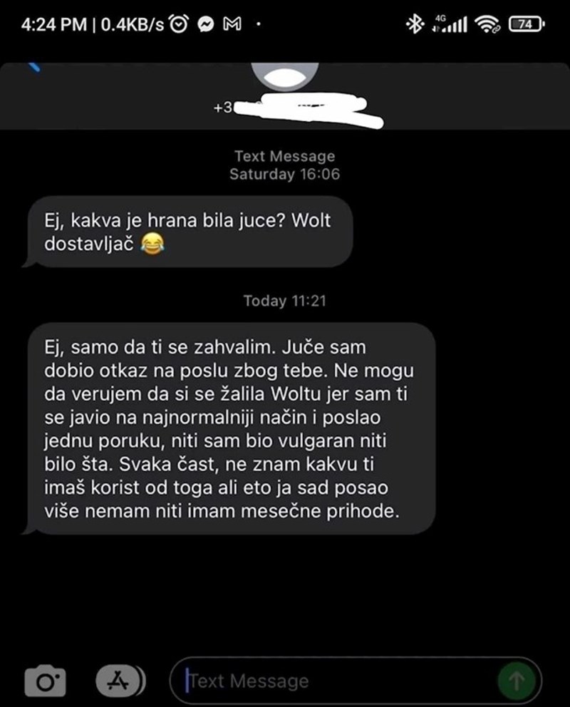 Naime, tamo je jedan dostavljač odlučio poslati poruku osobi kojoj je upravo dostavio hranu, a kako je stvar završila - pogledajte ispod.