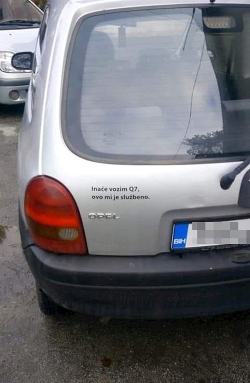 Ovaj vozač iz BiH nikako nije htio da netko pomisli da mu je mali Opel jedini auto koji vozi. Smatrao je da je potrebno objašnjenje pa je na stražnji dio zalijepio natpis kojim se htio opravdati.