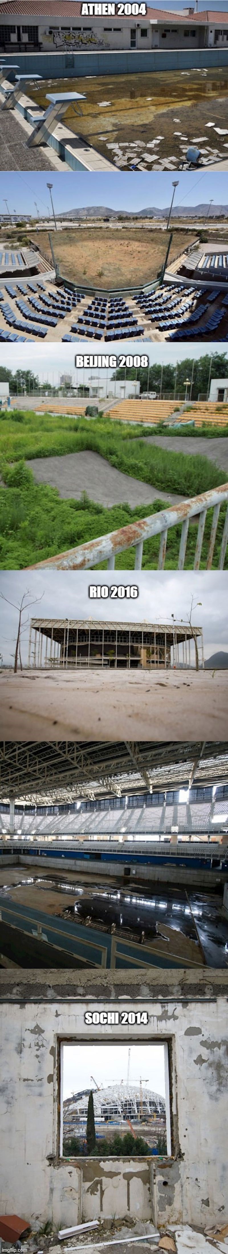 Na njima su vidljivi zapušteni bazeni, tereni, dvorane u raznim gradovima nekadašnjim domaćinima Olimpijskih igara. Milijuni i milijuni kuna poreznih obveznika potrošeni su na sada neupotrebljive građevine, o kojima se, izgleda, nitko nije pobrinuo još od onog dana otkad je natjecanje završilo! Nešto slično priči o našim dvoranama građenim povodom Svjetskog rukometnog prvenstva 2009. godine...