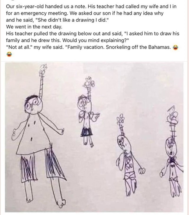 Učenici su dobili zadatak da nacrtaju sebe i svoju obitelj, a rad ovog šestogodišnjaka poprilično je zabrinuo učiteljicu koja je odmah sazvala hitan sastanak s njegovim roditeljima. Iza poprilično mračnog i šokantnog crteža zapravo se krije urnebesno objašnjenje! Najbolje da sami pogledate priču roditelja: