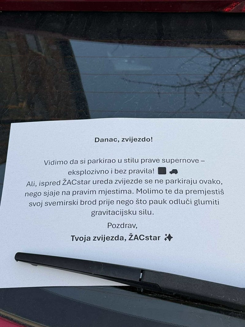 Pred jednim knjigovodstvenim uredom na zagrebačkoj Trešnjevci naišli smo na zanimljiv prizor. Naime, netko je ondje nepropisno parkirao auto pa je vlasnik ureda odlučio osloboditi svoju kreativnost kako bi na duhovit način očitao bukvicu nemarnom vozaču. Bravo, tako se to radi. 😁