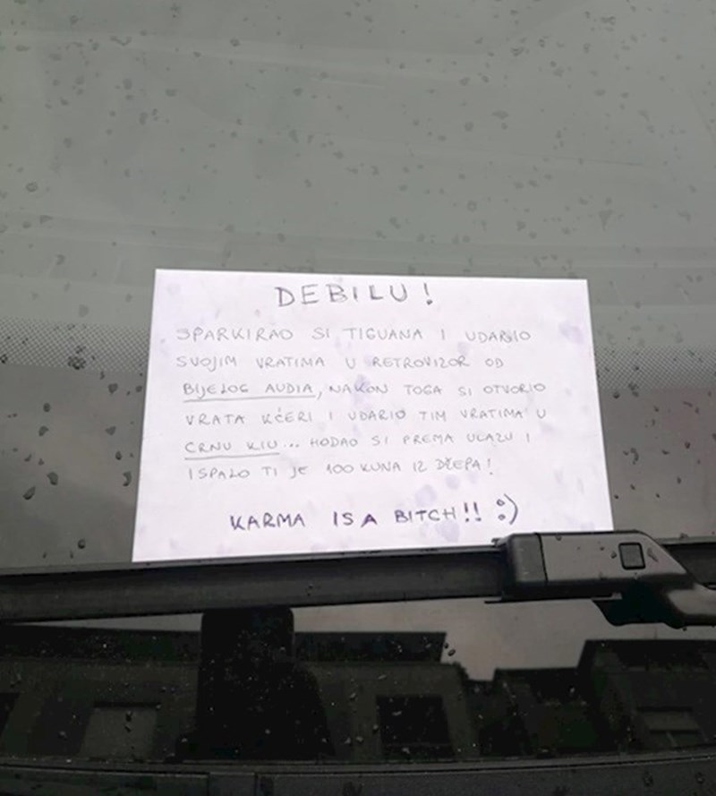 Sa zagrebačkog Črnomerca nam stiže genijalna poruka koju je netko ostavio jednom bezobzirnom vozaču. Dok je parkirao svoje vozilo i izlazio iz njega, oštetio je tuđe automobile, no na kraju nije primijetio da se i njemu dogodilo nešto loše.