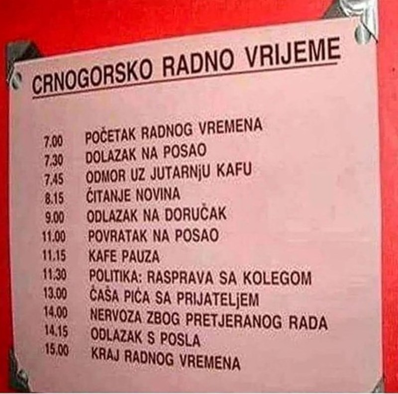 Crnogorci su diljem regije naveliko poznati po tome da nisu pretjerano radišni, a duhovita fotka tamošnjeg radnog vremena postala je ogroman hit na mrežama. 😝