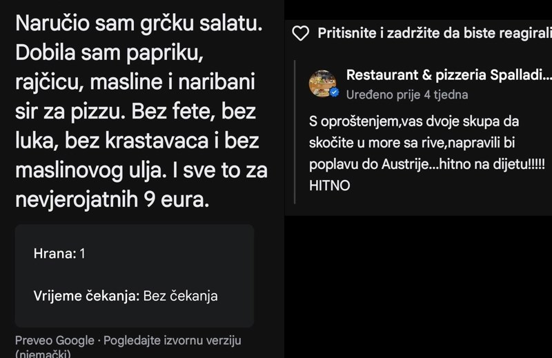 Sezona je u punom jeku, nervoza je na nešto višoj razini od trenutne temperature zraka, a to je dobitna kombinacija koja za posljedice ima urnebesna prepucavanja u recenzijama usluga u ugostiteljstvu... Evo ovotjednih pobjednika: