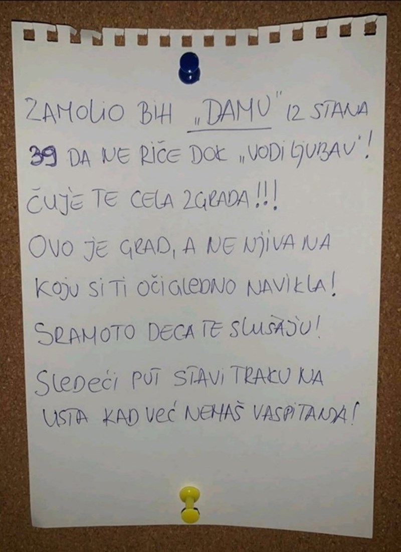 U zajedničkom hodniku jedne stambene zgrade negdje u Srbiji osvanula je poruka koja je izazvala lavinu reakcija na društvenim mrežama. Čovjek je sročio poruku u kojoj je na prilično vulgaran način opomenuo ženu iz stana 39 zbog buke koju navodno proizvodi.
