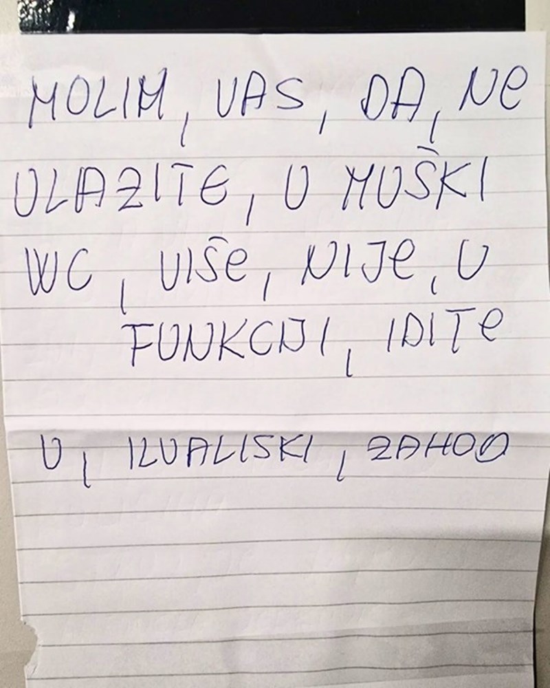 Pratitelje popularne Facebook stranice Dnevna doza prosječnog Dalamatinca nasmijala je obavijest ispred muškog wc-a. Ljude je nasmijalo što je autor ove obavijesti iza svake riječi napisao zarez, ali i način na koji je napisao "invalidski".