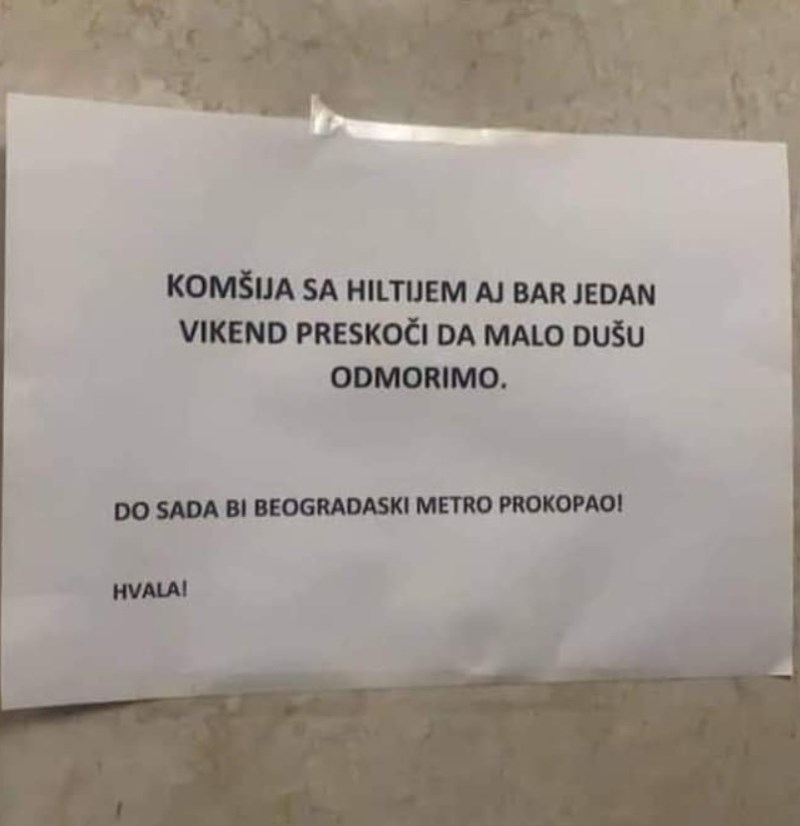 S problemom buke susreli su se stanari jedne zgrade u Beogradu, te su odlučili ostaviti poruku susjedu koji preuređuje! Hit je!