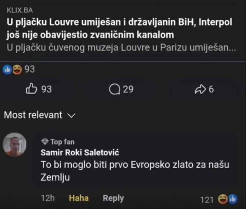Nakon šuškanja o sudjelovanju tipa iz BIH u pljački Louvrea, regiju je nasmijao genijalan komentar