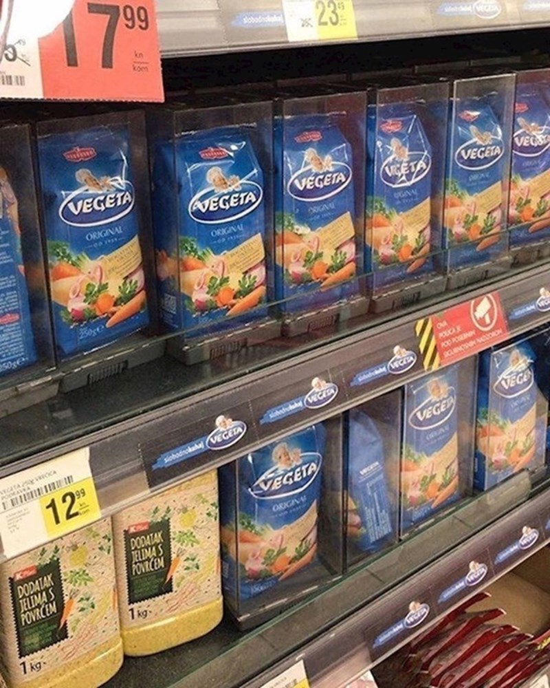 Uz sve ovo, na natpisu je bila obavijest na kojoj je pisalo da je polica "pod posebnim sigurnosnim nadzorom". Eto, ako ste slučajno mislili ukrasti vrećicu Vegete, zaboravite. Nemate nikakve šanse.