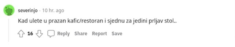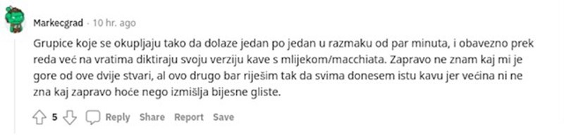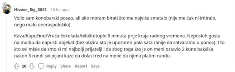 Kultura dugotrajnog sjedenja u kafićima i svakodnevnog posjećivanja istih, široko je rasprostranjena među Hrvatima pa onda nije zgorega znati kakvo je ponašanje poželjno u ovim ugostiteljskim objektima, budući da mnogi upravo tamo pokažu svoja najgora lica. Jedna korisnica Reddita (i sama konobarica) upitala je svoje kolege što je ono što im najviše ide na živce kod gostiju, a ovdje navodimo neke od odgovora i nadamo se da se nećete prepoznati u njima.