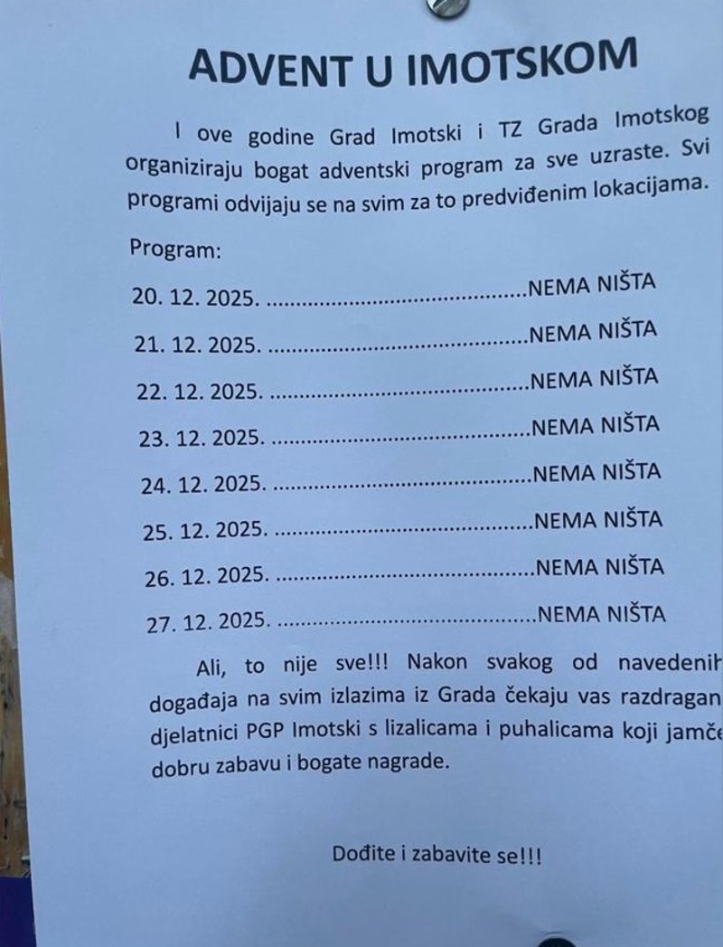 Program adventa u Imotskom širi se Hrvatskom brzinom munje, ironična objava skuplja tisuće lajkova