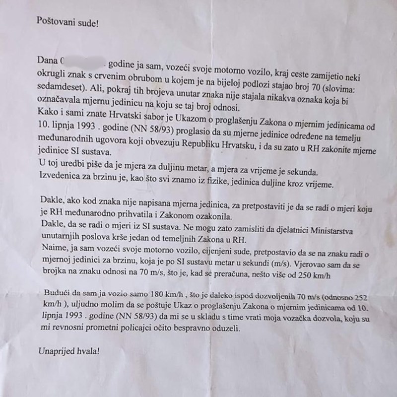 Tip je uhvaćen kako motorom juri 180 km/h, morate vidjeti suludu pritužbu koju je poslao sudu