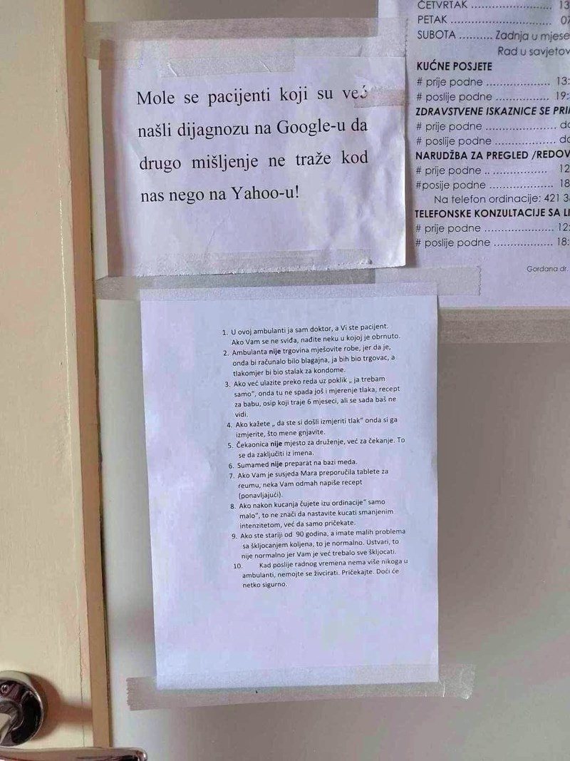 Dok je dijelu ljudi poruka liječnika iz jedne ambulante u Dalmaciji skroz simpatična i smiješna, većina se u komentarima slaže da malo više poštovanja prema pacijentima ne bi bilo na odmet.
