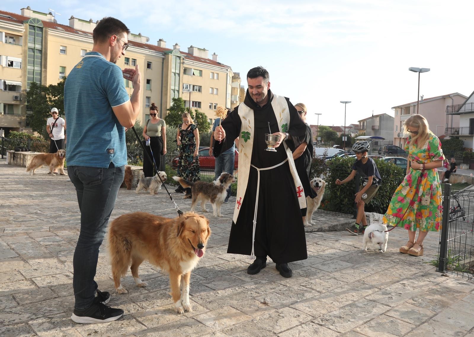 BROJNI Šibenčani sinoć su svoje pse i mačke vodili na - blagoslivljanje. Fra Šimun Markulin, župnik župe sv. Jeronima na Meterizama u Šibeniku, blagoslovio je kućne ljubimce i njihove vlasnike na platou ispred crkve.