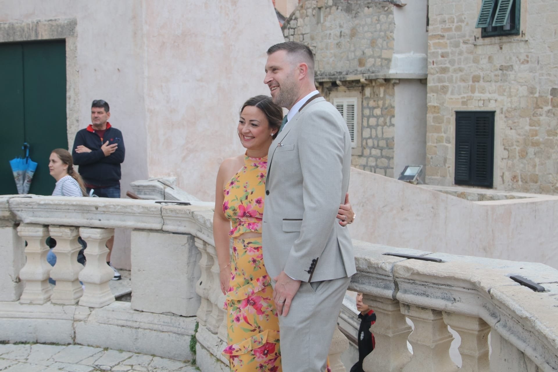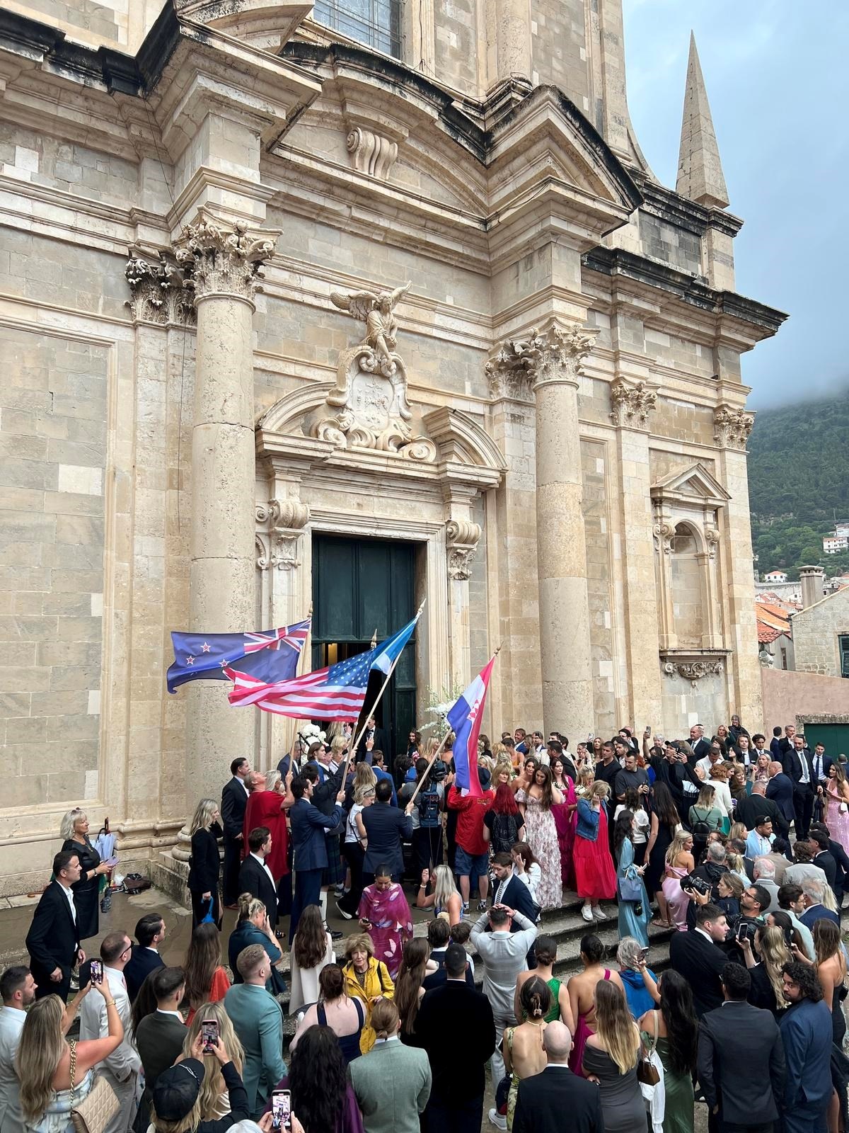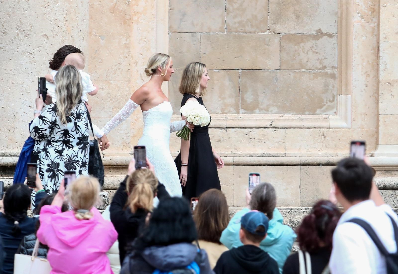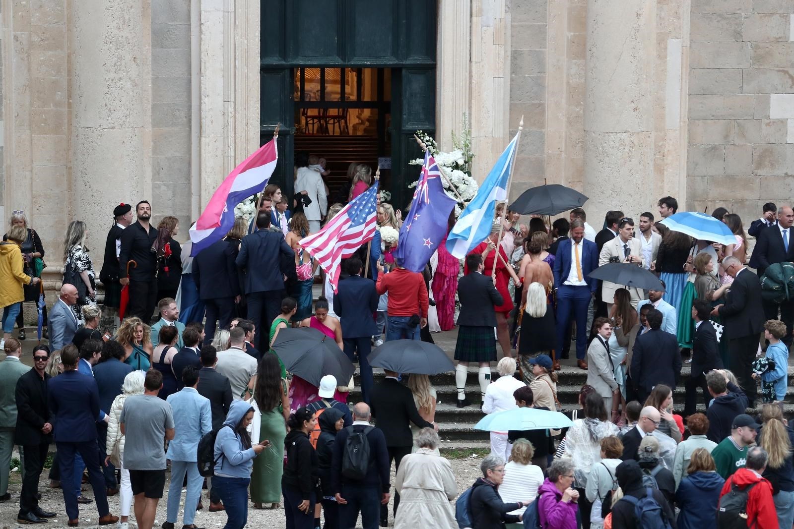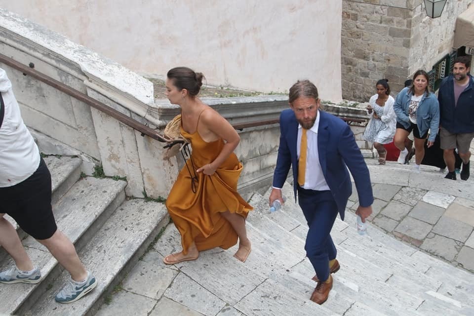 Kada je mladenka Nicole Artukovich stigla, počela je kiša pa su je natkrili velikim bijelim kišobranom. No bila je dobro raspoložena unatoč kiši. Mladoženja Liam Stewart obukao je bijelo odijelo. Prve fotografije objavio je Dubrovački dnevnik, a možete ih pogledati u galeriji.