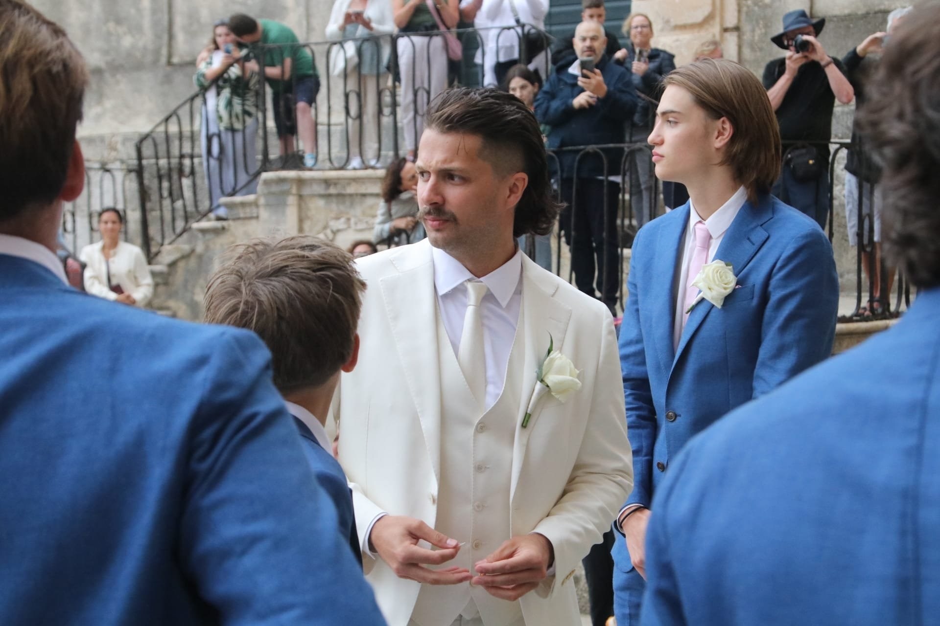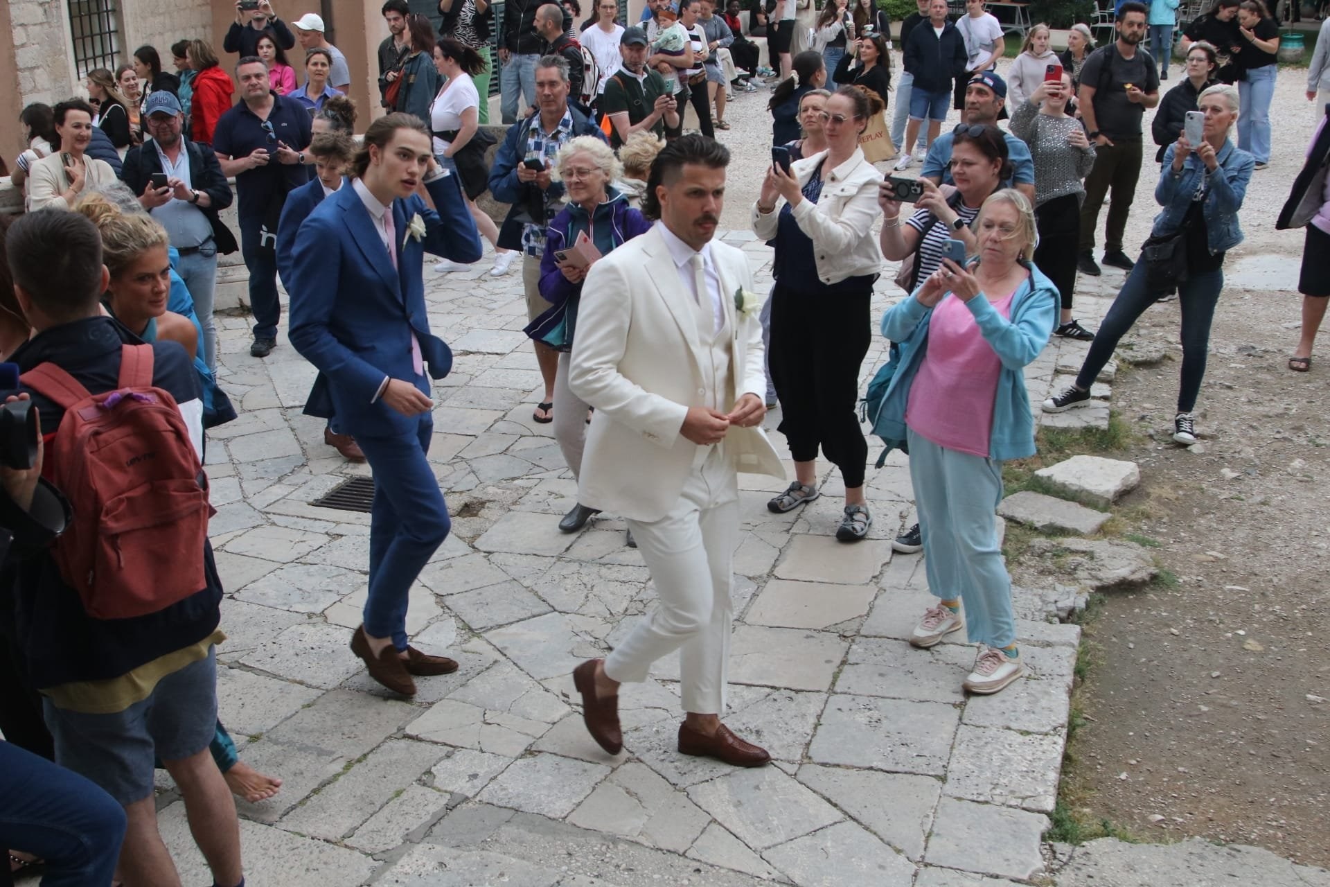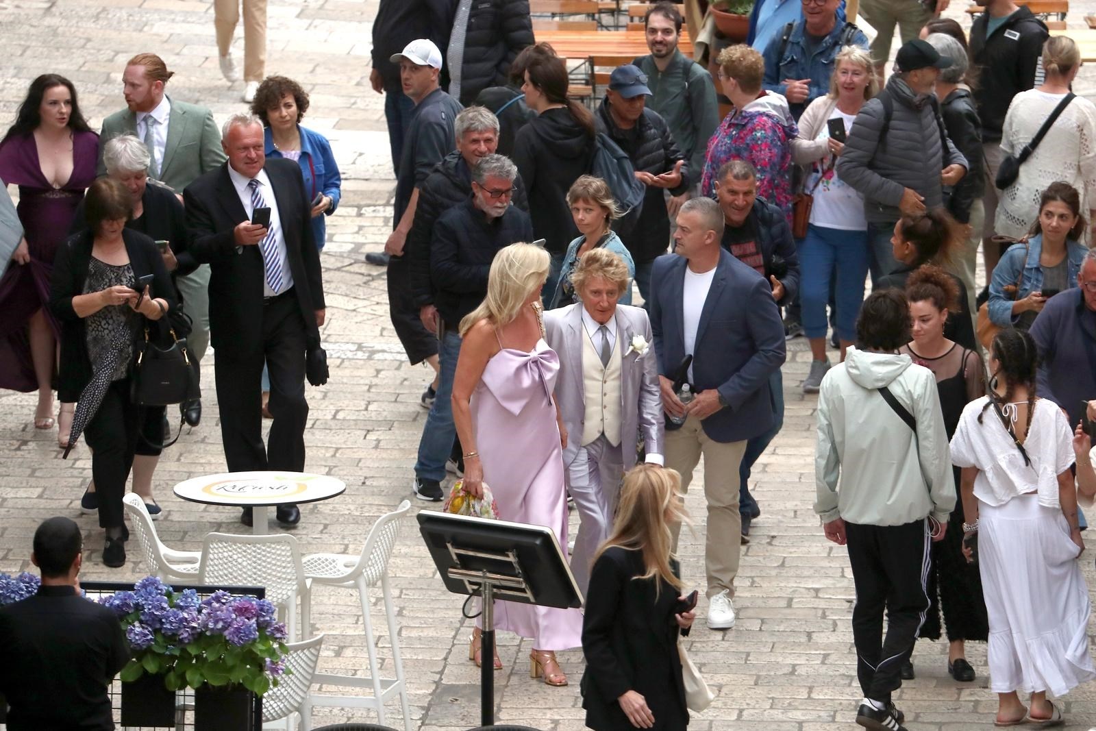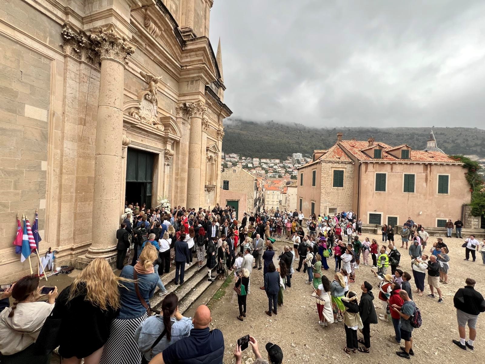 Gosti su se okupili ispred dubrovačke crkve sv. Ignacija na Jezuitima. Legendarni glazbenik među prvima je stigao ispred crkve i izazvao pomutnju. Turisti su ga opkolili kako bi se slikali s njim.