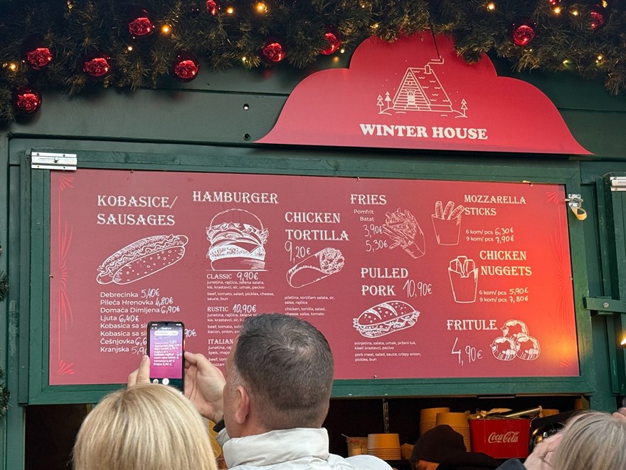 Ponuda hrane varira od povoljnijih hotdogova za 4 – 5.50 eura, pa sve do skupljih opcija poput telećeg hot doga za 10 eura, bao bunova koji se kreću od 8 do 9.50 eura, te germknedli idu i do 10 eura (Dubai verzija). Ima i “težih” zimskih opcija – recimo, domaći gulaš košta 9 eura, dok je combo ponuda (piće + hrana) uglavnom oko 6 do 10 eura.