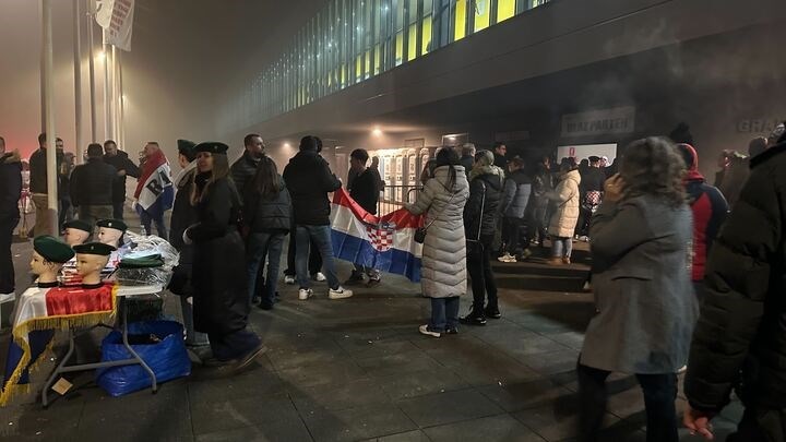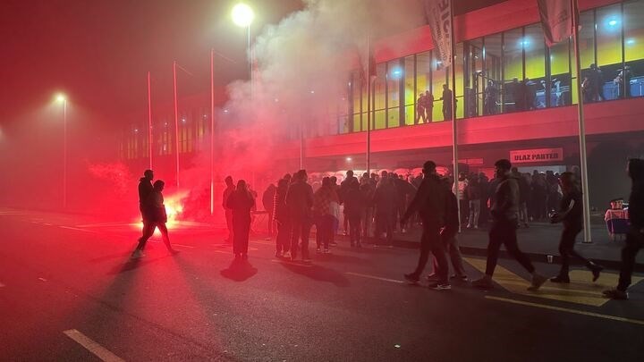 Mnogi su sa sobom ponijeli rekvizite poput zastava, a ispred Arene su se palile i baklje.