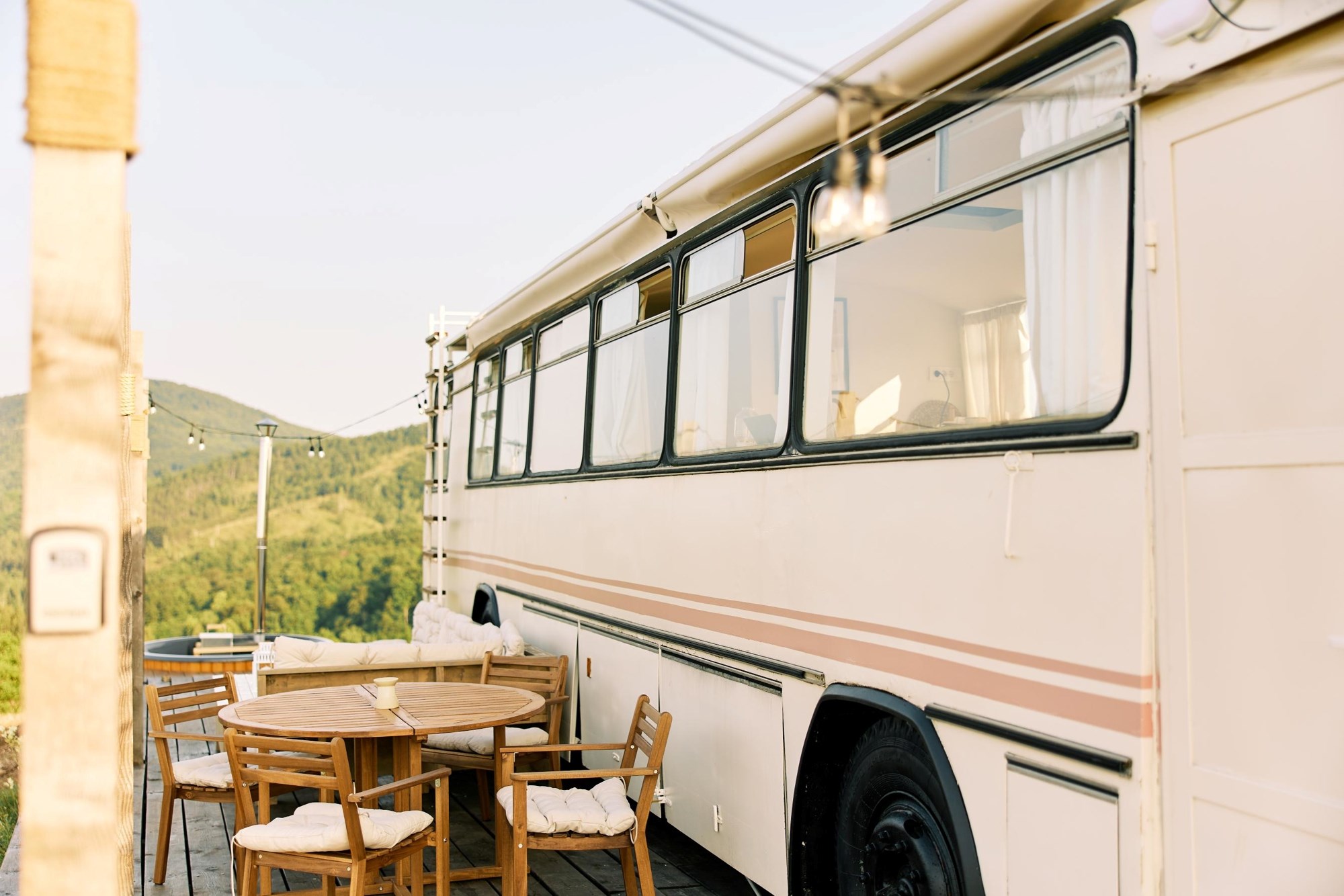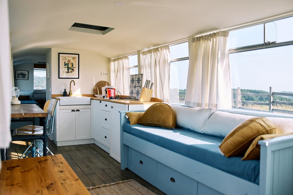 Autobus dug čak 11 metara ima baš sve: rustikalnu kuhinjicu, potpuno funkcionalnu kupaonicu, king size krevet u stražnjem dijelu i još dvije sofe koje mogu poslužiti kao dodatni krevet za klince. U sklopu ove neobične vikendice ispred je i poveća terasa i vruća kupka na otvorenom - sve s pogledom na planinu i netaknutu prirodu u okolici.