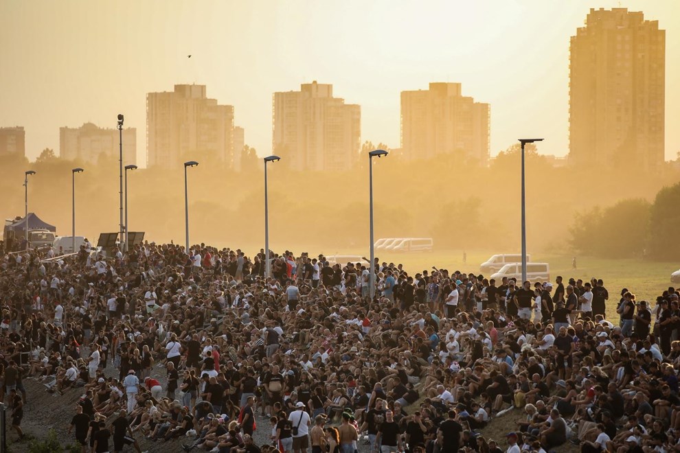 Fotografi su snimili mnoštvo ljudi koji stoje na Mostu slobode i na savskom nasipu, odakle se pruža pogled na Hipodrom.