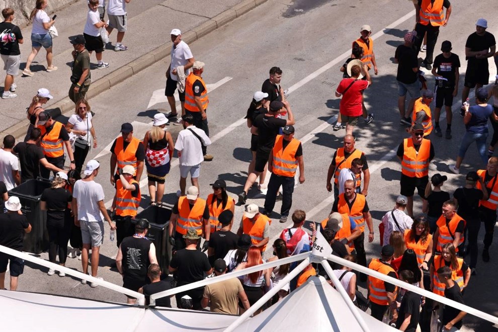 Posjetitelji se smireno kreću prema ulazu, bez naguravanja i u opuštenoj atmosferi. Mnogi od njih ogrnuti su hrvatskim zastavama, a pri dolasku do ulazne točke pokazuju svoje ulaznice radnicima zaduženima za provjeru.