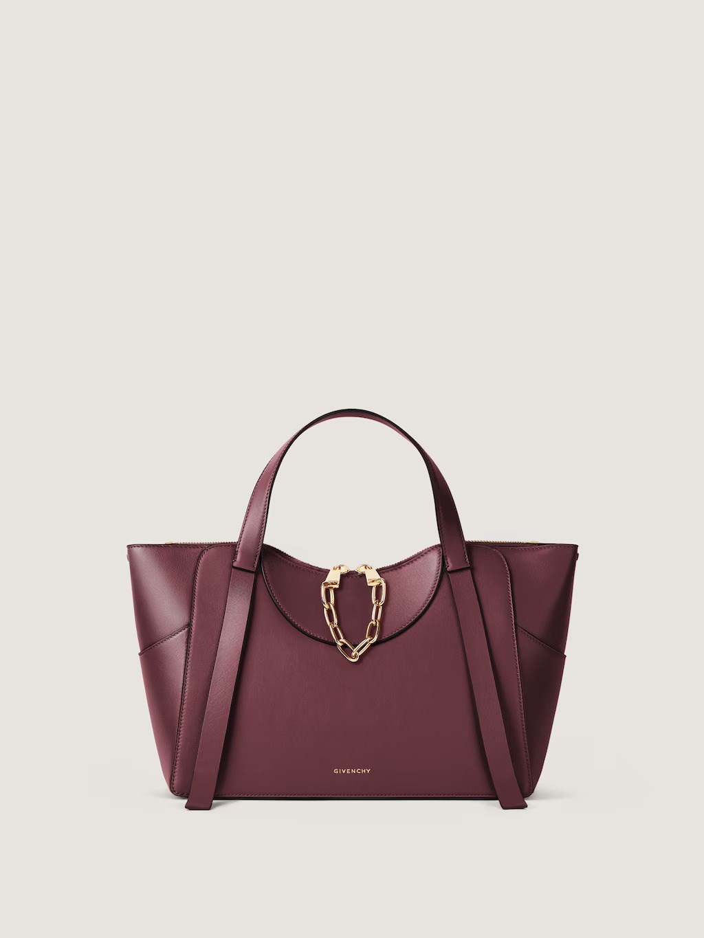 Izrađena od podatne teleće kože s prirodnom teksturom, vanjština torbe uravnotežuje mekoću i čvrstoću. Unutrašnjost s kontrastnom podstavom od nappa kože donosi dašak boje koji se otkriva pri otvaranju. Meke linije nadopunjene su metalnim detaljima, dostupnima u zlatnoj i srebrnoj boji. Metalni lanac, kutni zatvarači i decentne metalne nožice daju silueti suptilan, ali oštar izgled.