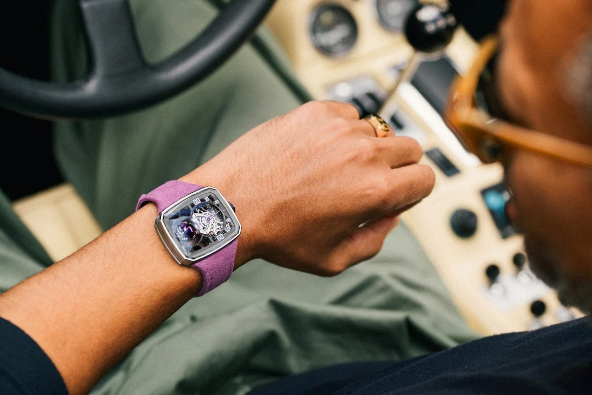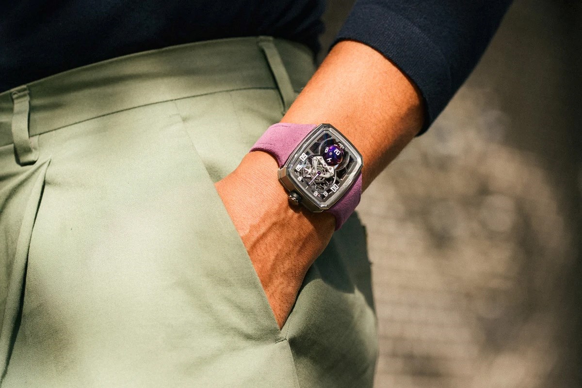 Dizajn kućišta pametno je osmišljen - većina volumena raspoređena je horizontalno, što ga čini ugodnim za nošenje, piše portal A Blog To Watch. Budući da nema tradicionalne lugove, ljubičasti remen od brušene kože spaja se izravno s kućištem. Odsjaj je sveden na minimum zahvaljujući kvalitetnom antirefleksivnom premazu.
