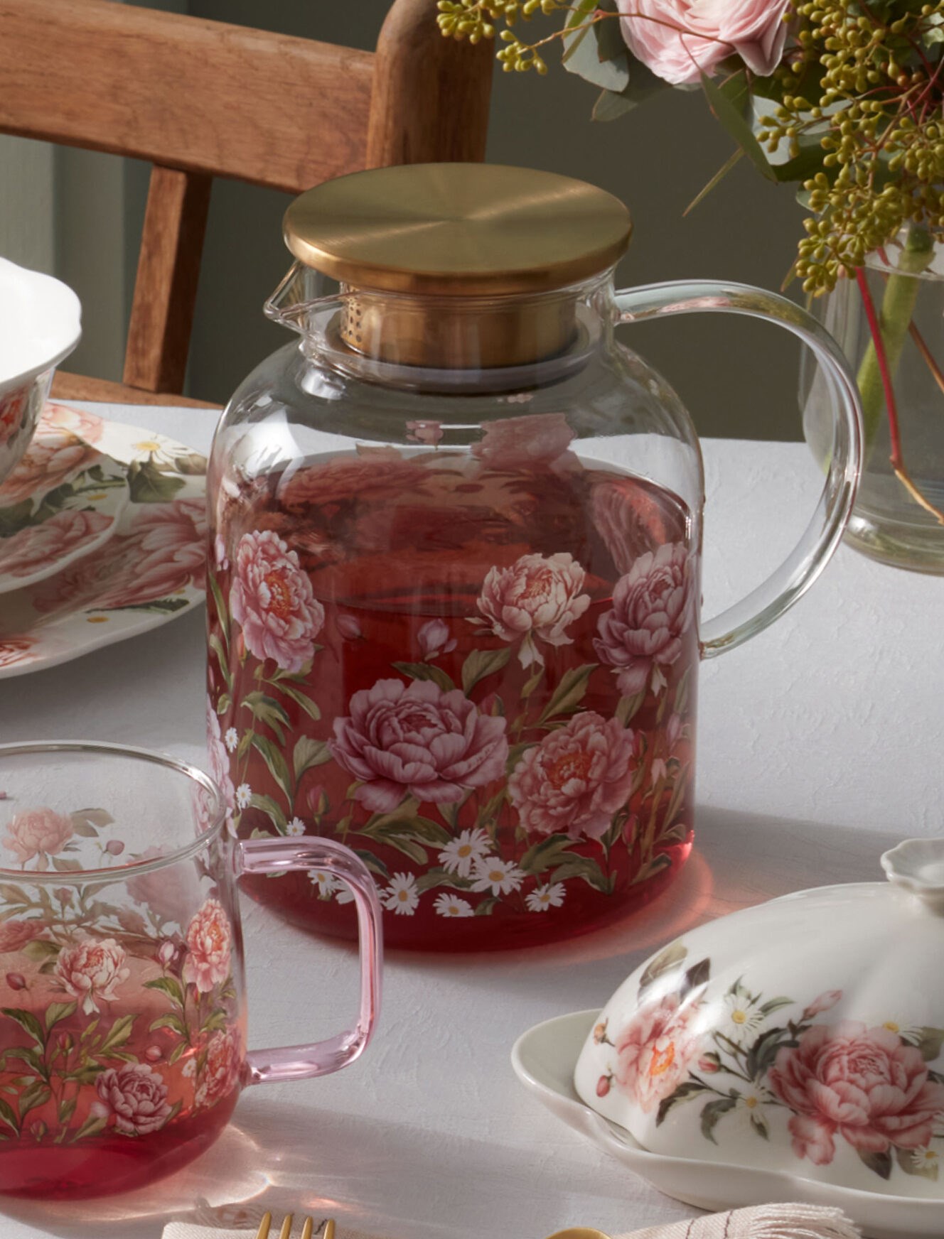 Među novitetima su keramičke zdjele, tanjuri i čajnici s nježnim cvjetnim motivima u ružičastim tonovima, staklene čaše, šalice i staklenke s cvjetnim uzorcima te ružičasto-zlatni pribor za jelo. Kolekciju prate i zavjese te kuhinjske krpe sa zelenim i cvjetnim uzorcima te dekorativne daske za rezanje koje se uklapaju u proljetnu priču.