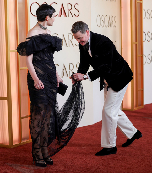 Minimalistički look s klasičnim krojem pokušao je osvježiti sunčanim naočalama, no mnogi su u komentarima napisali da je kombinacija djelovala pomalo neobično za glamuroznu večer poput Oscara.