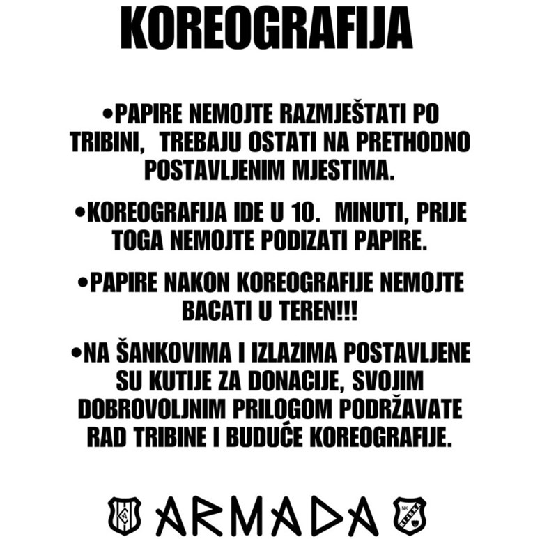 Na nama je da se gosti predaju čim prođu Tuhobić, a naši igrači osjete što znači letjeti na krilima Armade! Zato u subotu idemo svi na zadnji trening Rijeke od 17 sati, okupljanje je od 16 sati u Dockeru, ovo je prilika i onima koji nisu uspjeli doći do ulaznice da daju svoj doprinos, a u nedjelju idemo napuniti stadion što ranije tako da pehar može odmah krenuti prema Kvarneru!!