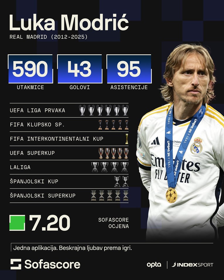 LUKA MODRIĆ odigrat će danas svoju zadnju prvenstvenu utakmicu za Real Madrid. U klub je stigao 2012. godine, a u međuvremenu je postao kapetan, legenda i ikona s najviše osvojenih trofeja (28) u njegovoj povijesti. Njegova oproštajna utakmica od Madrida igra se od 16:15, suparnik je Real Sociedad, a susret se igra uz direktan prijenos na kanalu Arena Sport 5. Moći ćete ga pratiti i u tekstualnom prijenosu na Indexu.