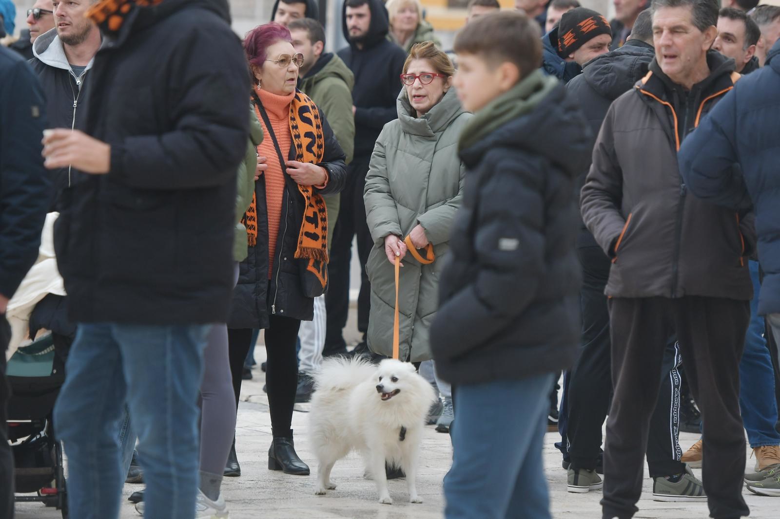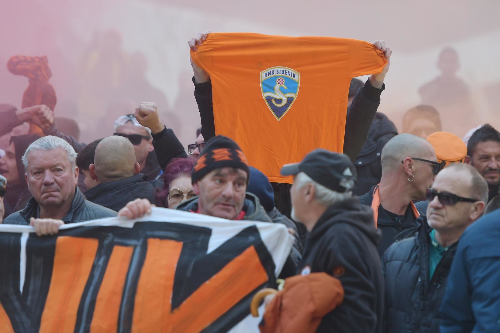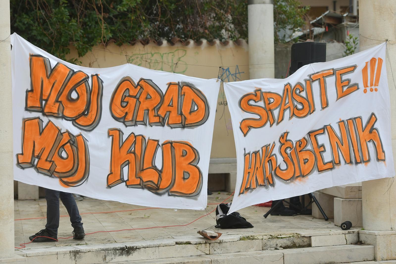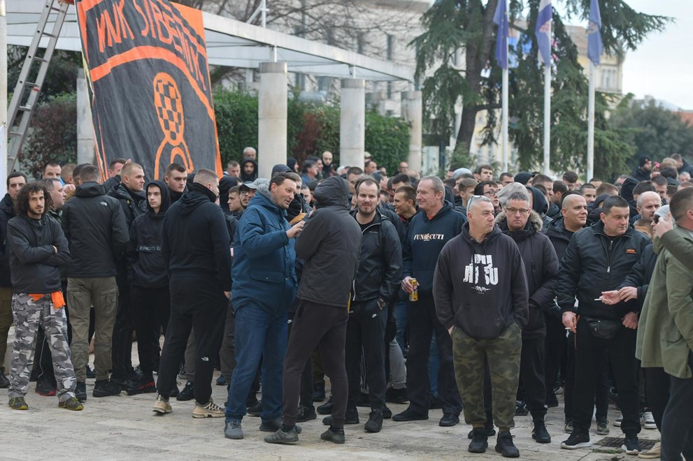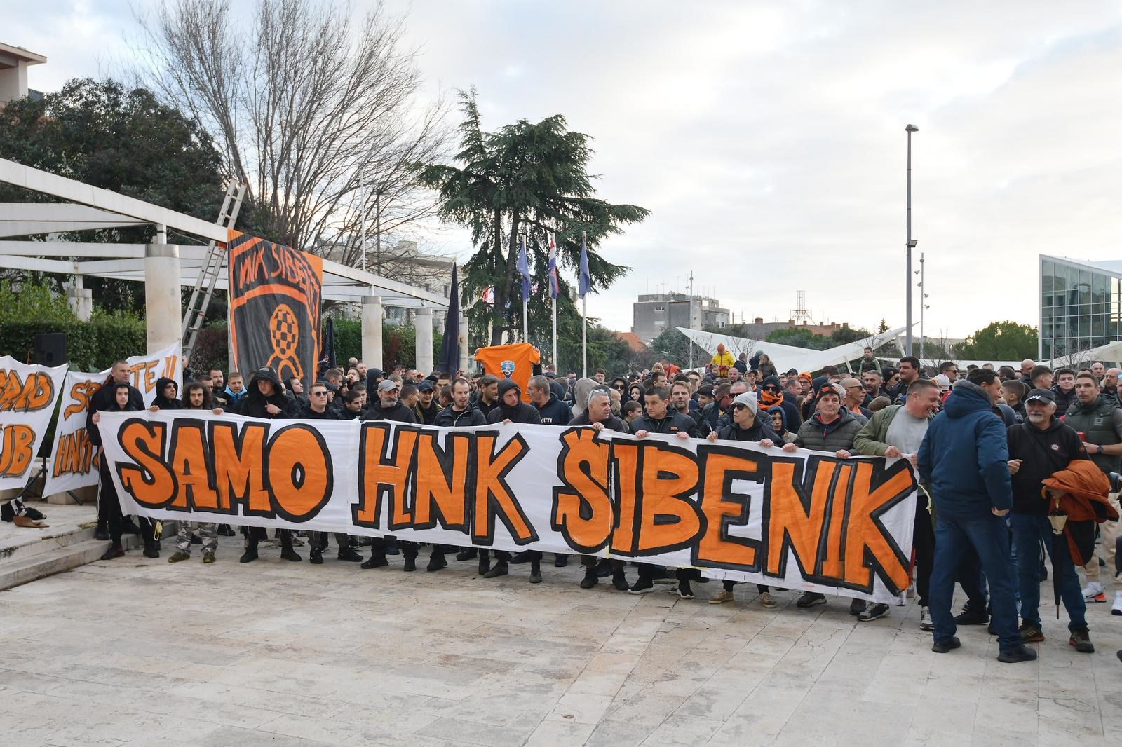 NAVIJAČI Nogometnog kluba Šibenik održali su prosvjed ispred zgrade gradske uprave. Oko 500 Funcuta, najvjernijih navijača šibenskog kluba, buni se protiv vlasnika kluba Željka Karaice. Krive ga za loše stanje u nekadašnjem prvoligašu te ispadanje u četvrti rang hrvatskog nogometa. Na prosvjedu se obratio gradonačelnik Željko Burić.