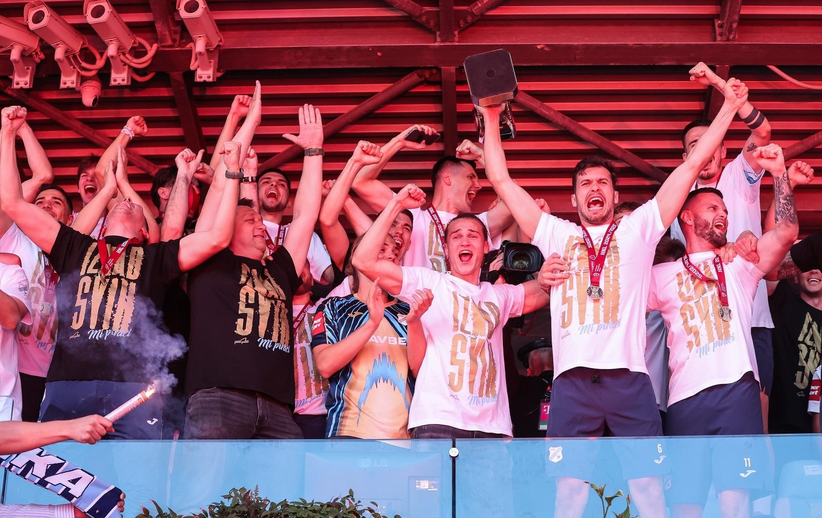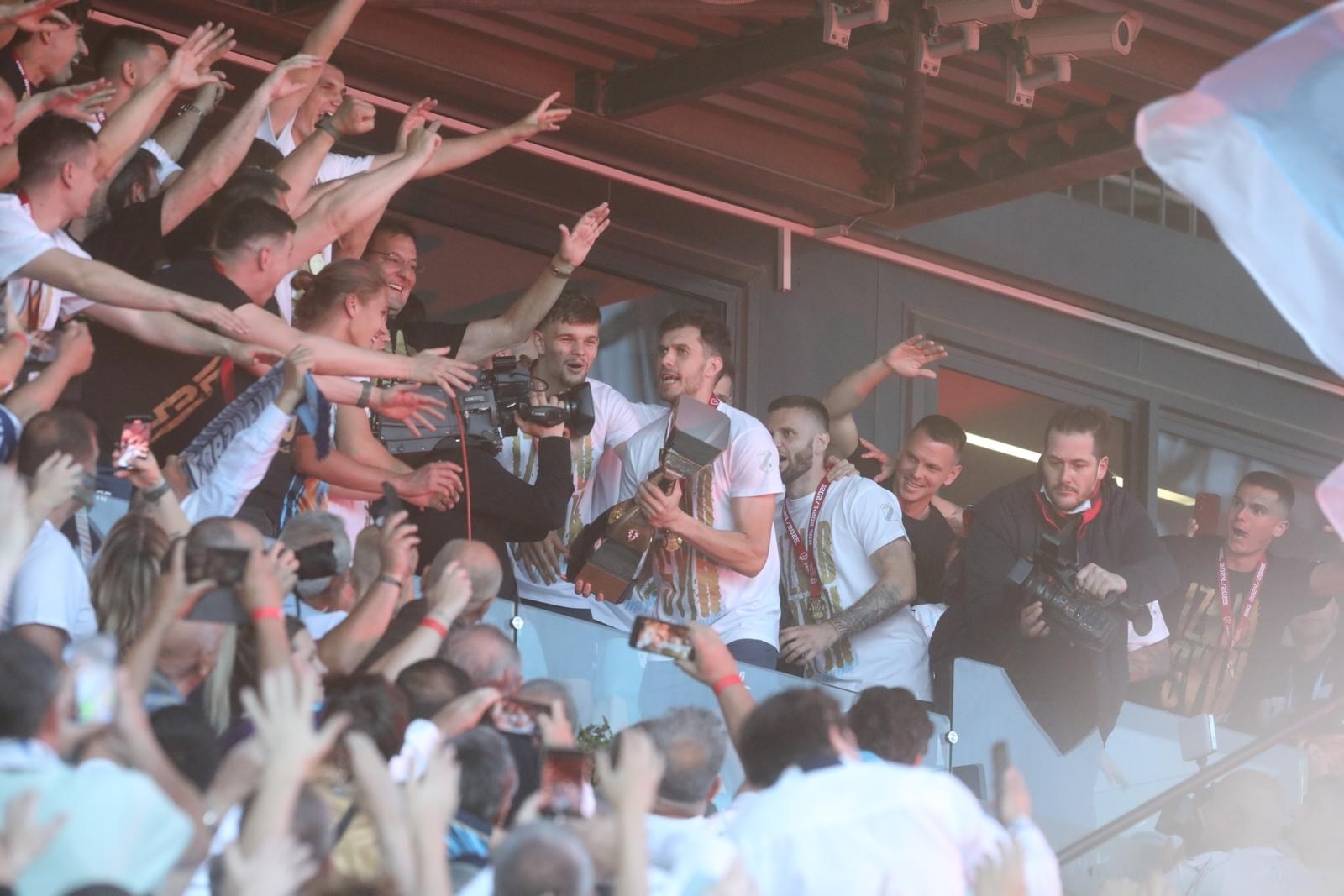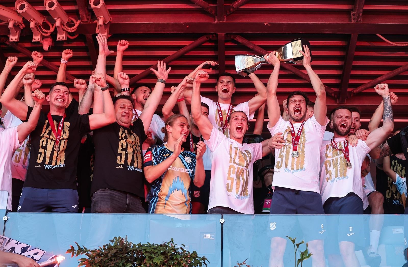 Na stadionu Rujevica čeka se početak dodjele trofeja. Nije to baš jednostavno jer se igrači, koji su u slavlju, moraju skupiti po terenu, svlačionicama, tribinama...