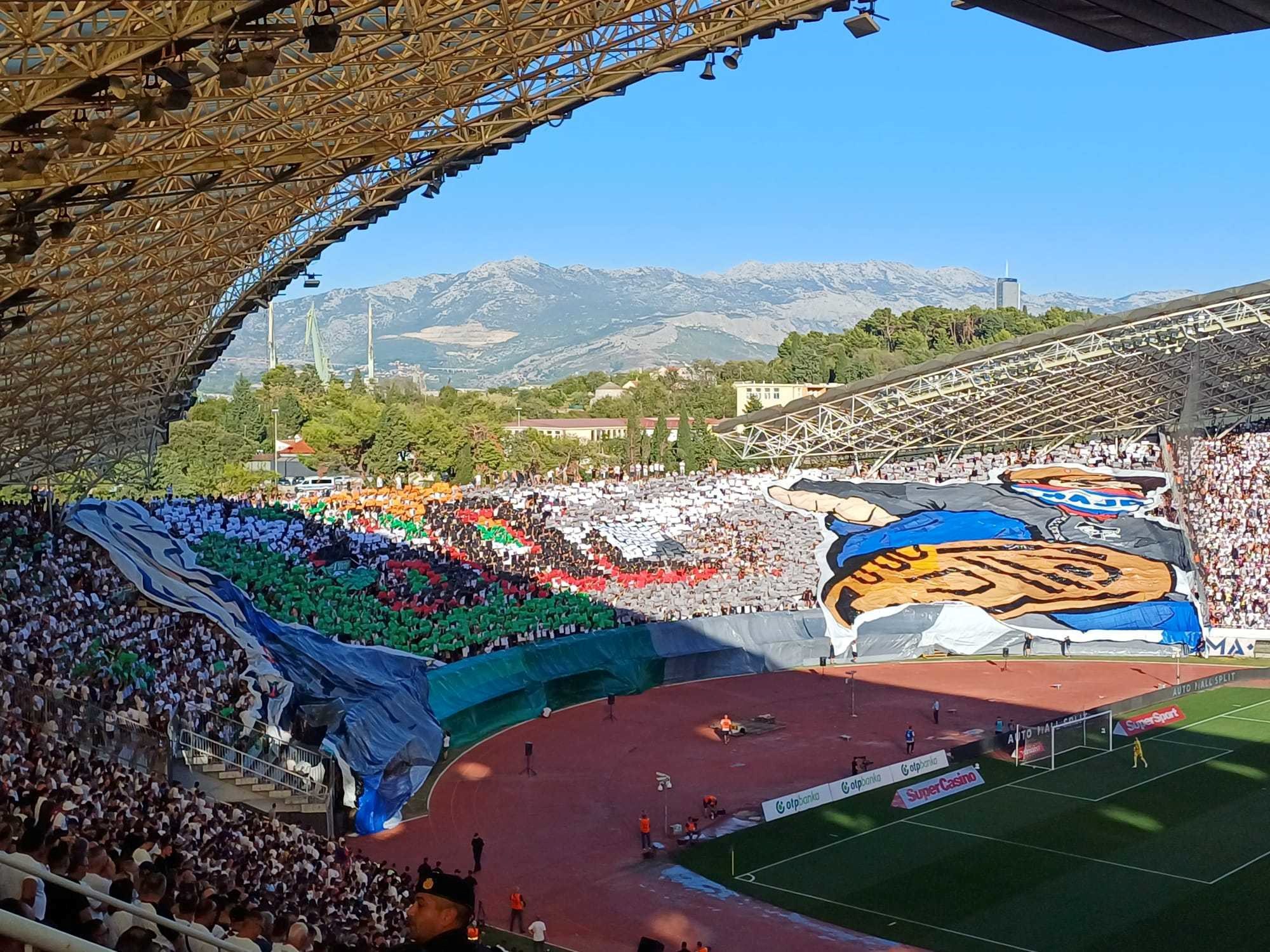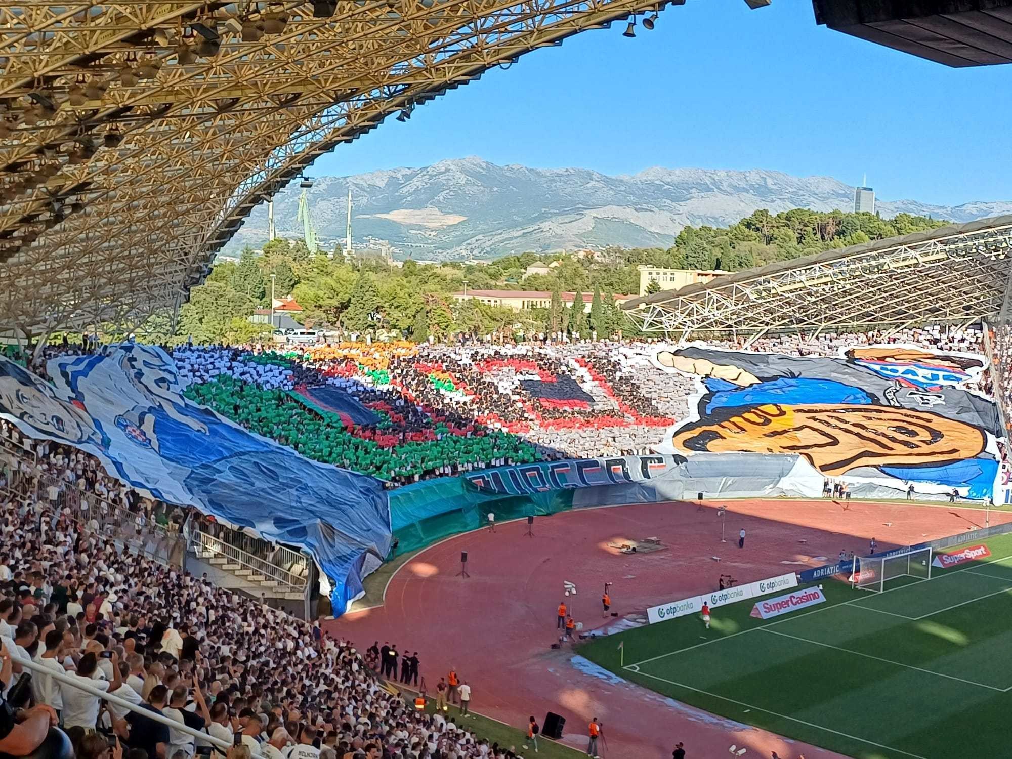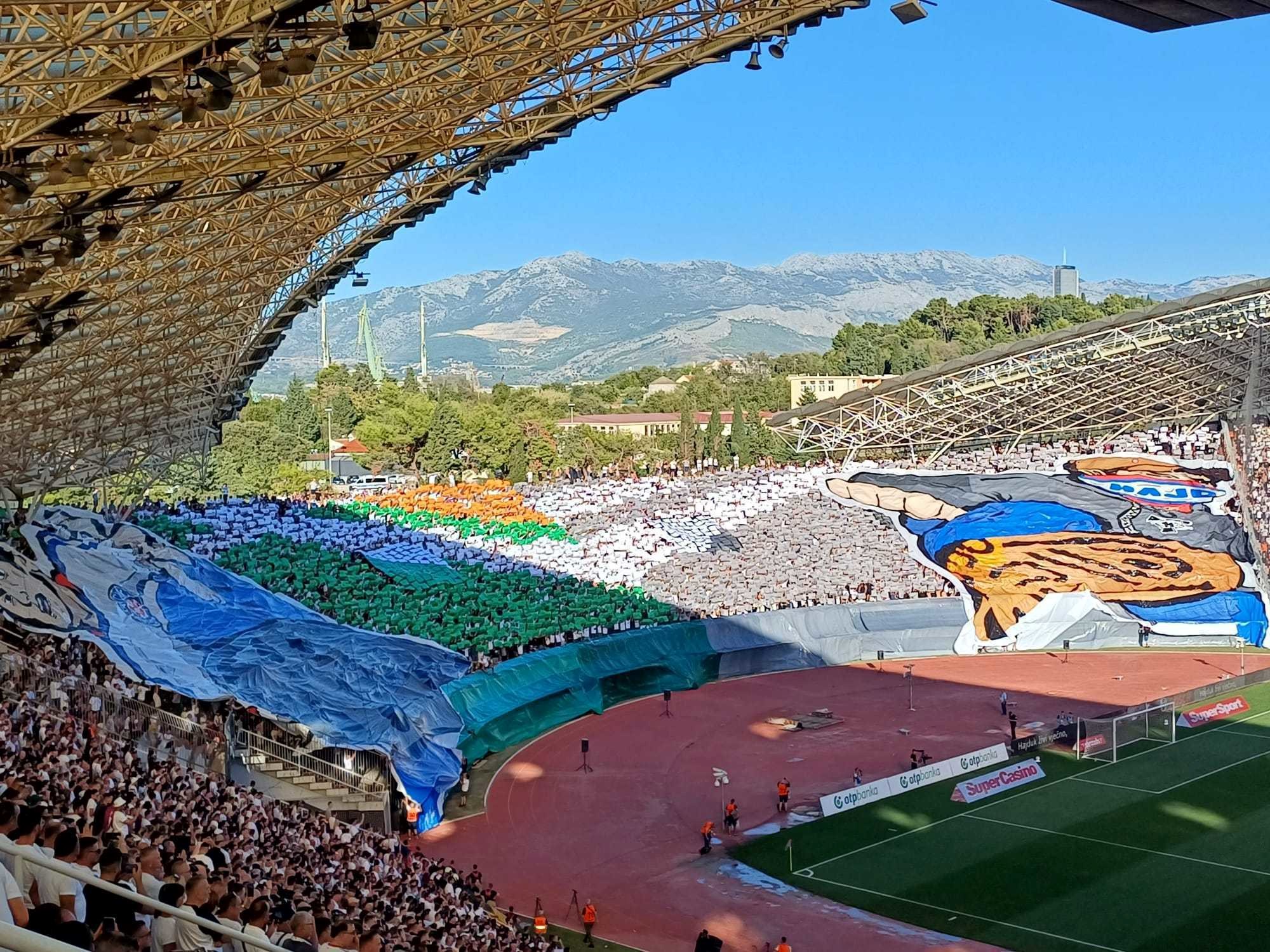 Uoči dvoboja je Torcida na sjevernoj tribini podignula koreografiju. Na njoj se vide ilustrirani pripadnici Torcide koji udaraju nogom, a u sredini je veliki natpis: "GAZI!".