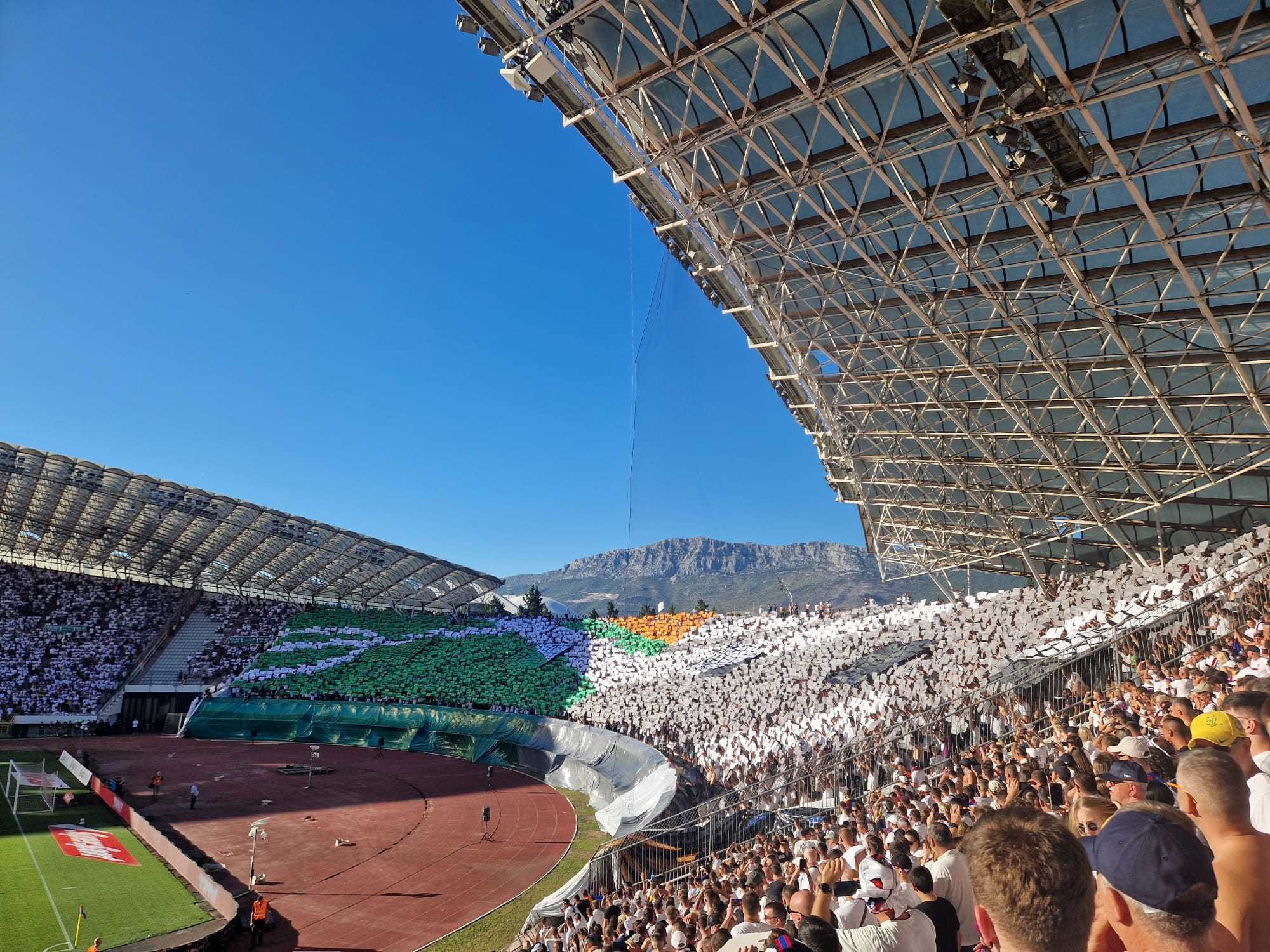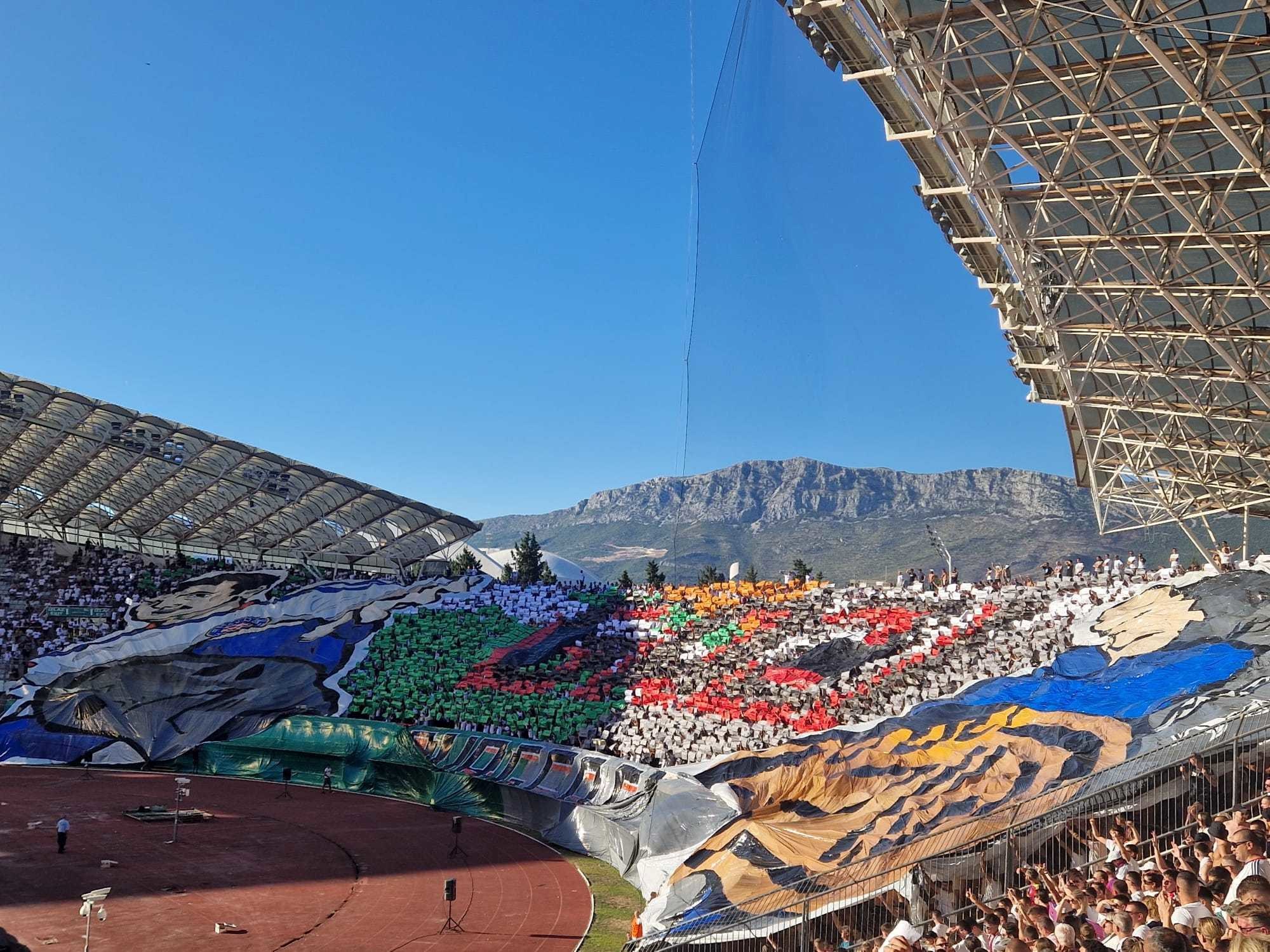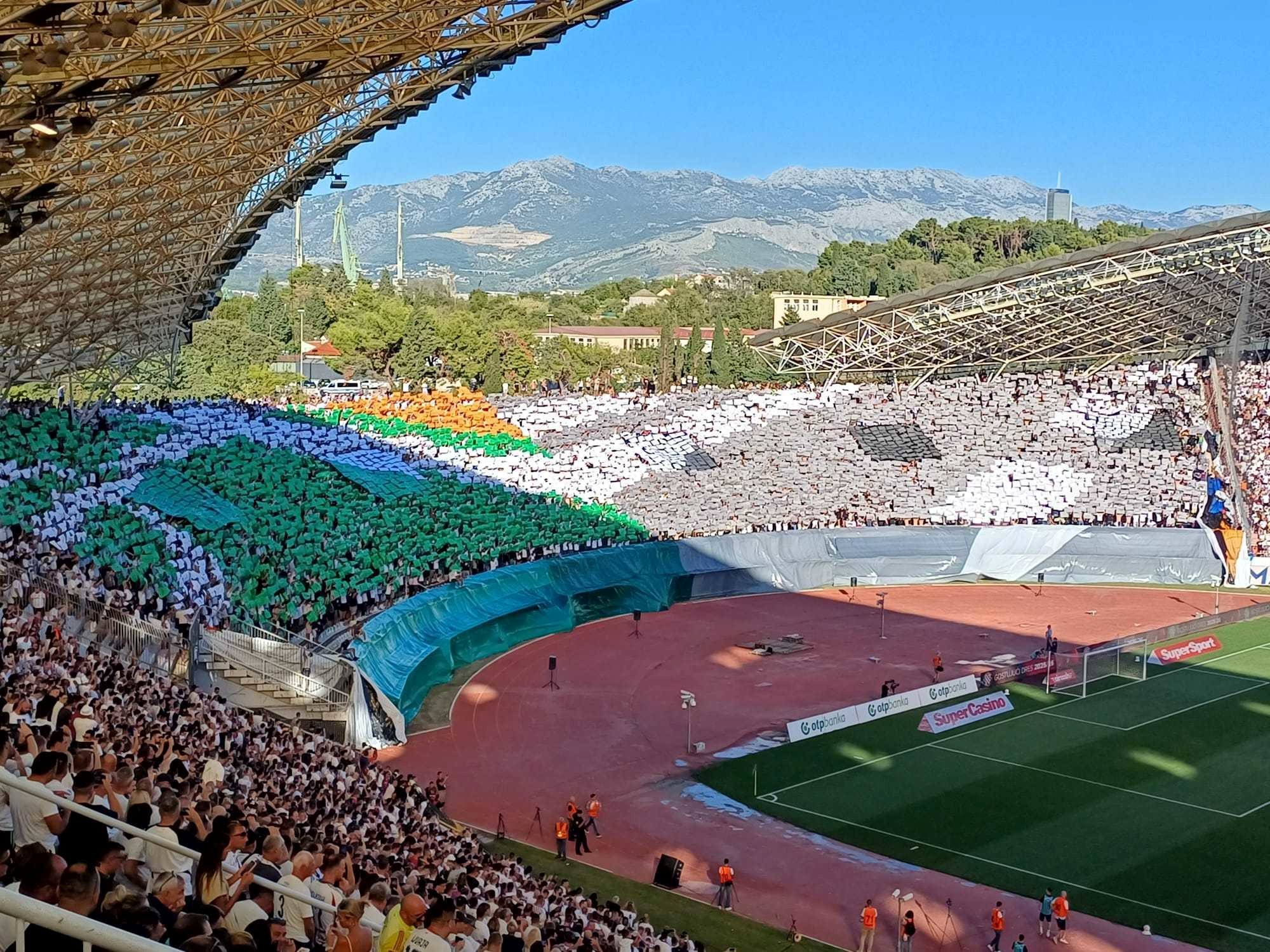 Uoči dvoboja je Torcida na sjevernoj tribini podignula koreografiju. Na njoj se vide ilustrirani pripadnici Torcide koji udaraju nogom, a u sredini je veliki natpis: "GAZI!".