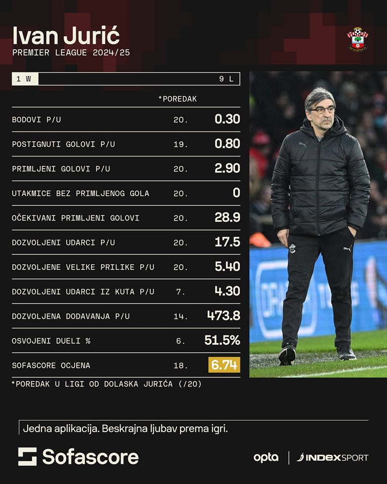 NEKOLIKO dana prije Božića prošle godine Ivan Jurić službeno je potvrđen kao novi trener Southamptona. Potpisao je ugovor na 18 mjeseci. Bilo je to u trenucima kad je Southampton bio posljednja momčad tablice Premier lige. Deset ligaških utakmica kasnije, Southampton je i dalje zadnji, a Jurićeve ideje nikako ne donose rezultate klubu.