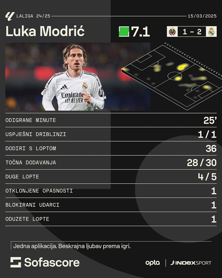 Modrić je u igru ušao u 65. minuti utakmice kojom se Real, barem privremeno, vratio na vrh ljestvice španjolskog prvenstva. Učinkom koji je ostvario u pola sata igre oduševio je španjolske medije do te mjere da neki od njih navode kako uopće ne bi trebalo razmišljati o produženju ugovora s 39-godišnjim kapetanom momčadi.