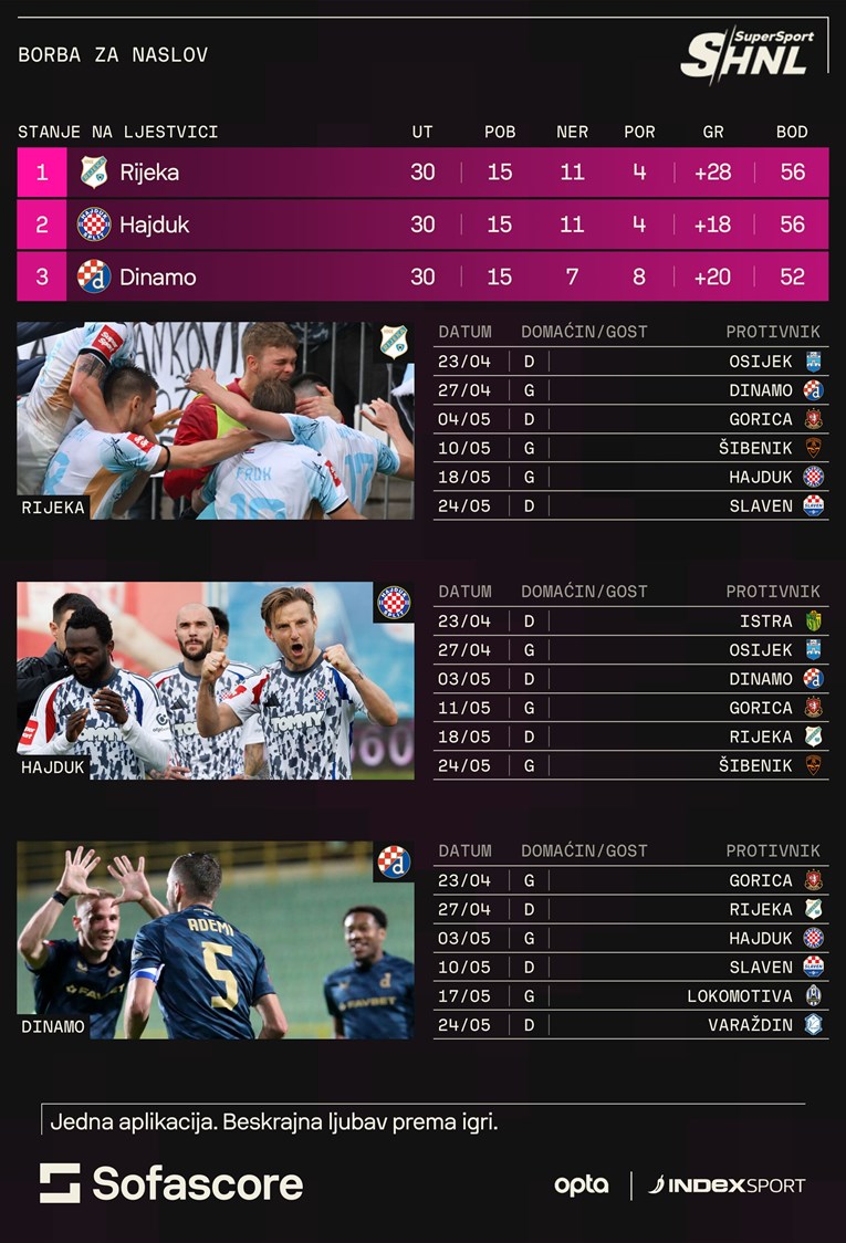 ŠEST KOLA ostalo je do kraja sezone u SuperSport HNL-u. U uzbudljivu završnicu natjecanja Rijeka i Hajduk ulaze kao bodovno izjednačene momčadi na vrhu poretka, a trećeplasirani Dinamo s -4 u odnosu na njih. Sve tri momčadi još moraju odigrati jedan međusobni susret i sve tri i dalje imaju šansu za naslov.