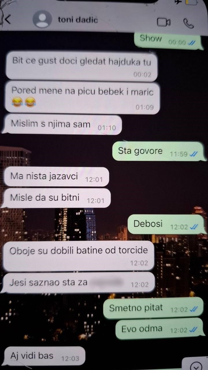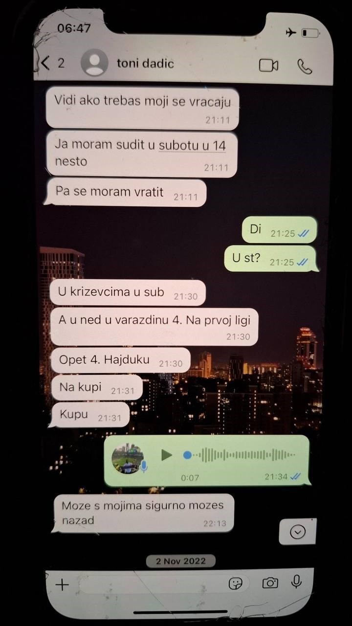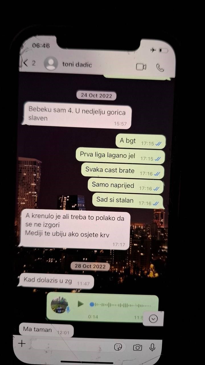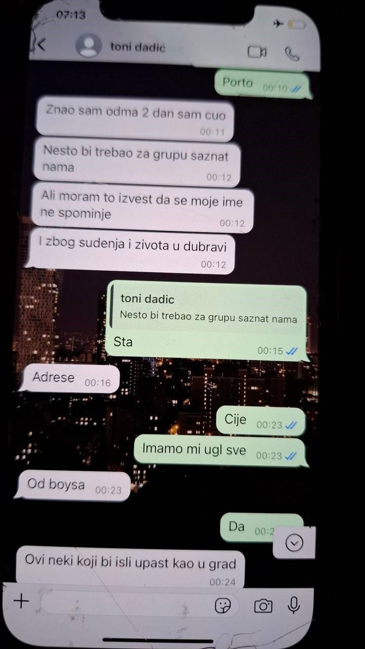 Dadić je navodno spominjao i "usluge koje treba napraviti grupi", poput one da pribavi kućne adrese viđenijih Bad Blue Boysa. U jednoj od poruka navodno kaže i kako "mora paziti zbog suđenja i zbog života u Dubravi". Sve navodne poruke možete vidjeti u našoj galeriji.