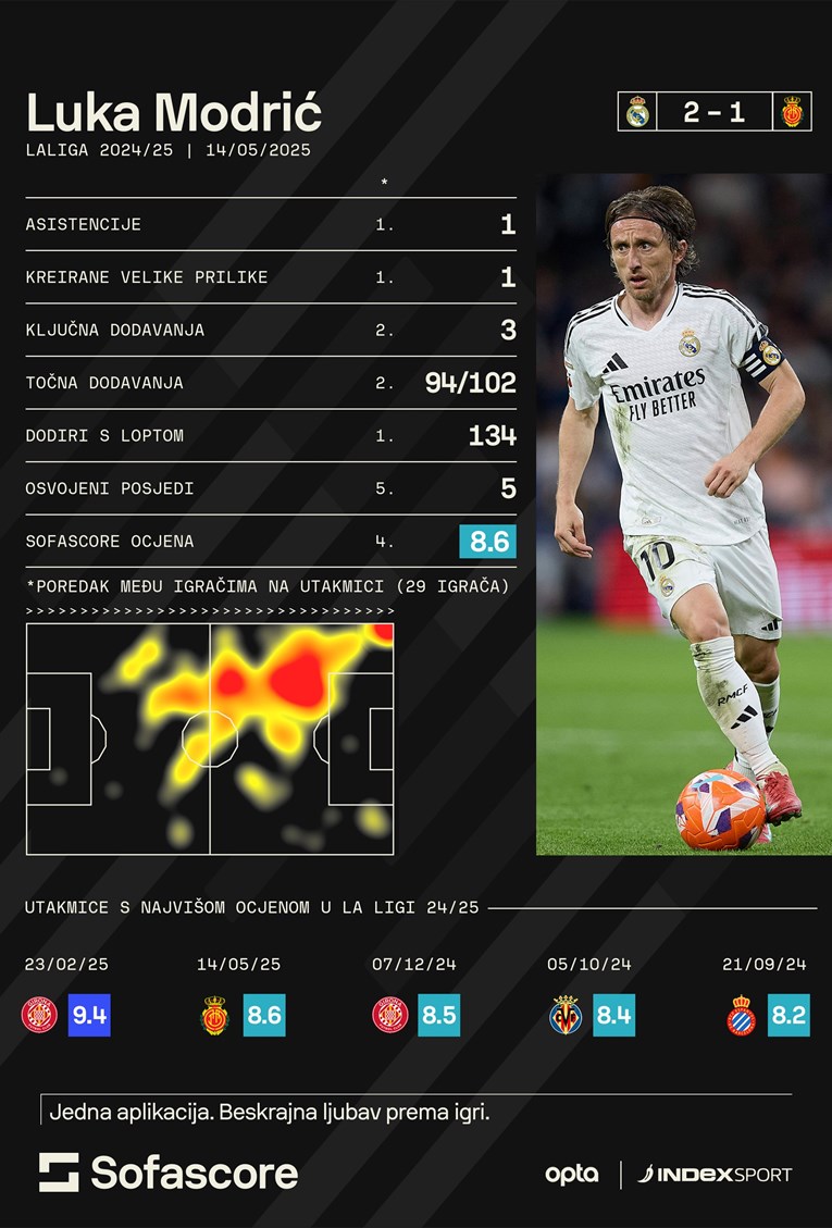 Kapetan Hrvatske i Reala imao je, uz upisanu osmu asistenciju ove sezone, 94/102 točno predane lopte, tri ključna dodavanja, 7/10 osvojenih duela, ali i kontrolu lopte tijekom svih 95 minuta. Ističu to i španjolski mediji.