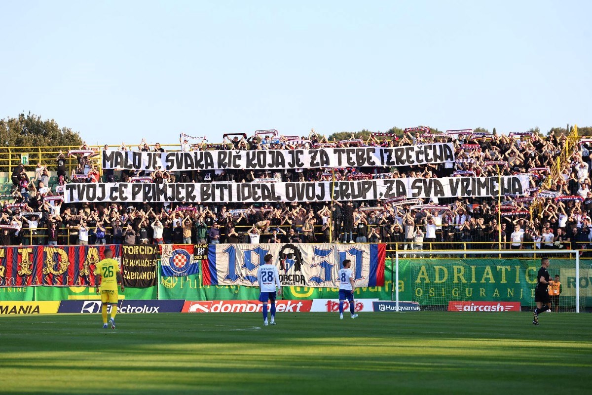 Torcida je tijekom utakmice podigla čak tri transparenta koji su podignuti za Žana Ojdanića, Josipa Jovića i protiv "drukera". Prvi transparent podignut je u 10. minuti dvoboja u čast 10. godišnjice smrti bivšeg vođe Torcide Žana Ojdanića. "Malo je svaka rič koja je za tebe izrečena, tvoj će primjer biti ideal ovoj grupi za sva vrimena", pisalo je na transparentu. Uz to su skandirali "Hvala ti, Žane", a zatim zapjevali "Ima jedna duga cesta".
