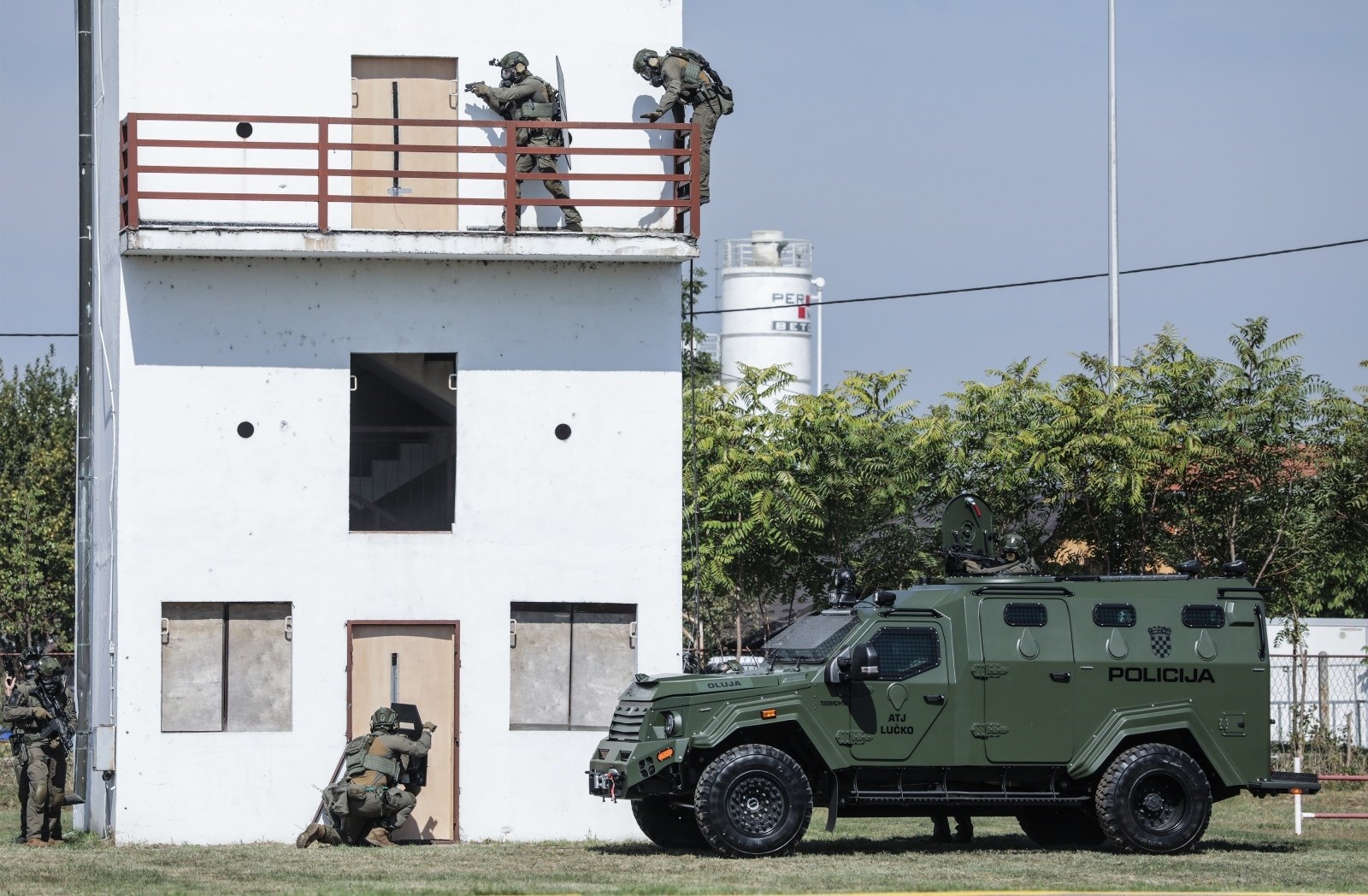 Demonstracijska vježba, koja je nalikovala snimanju akcijskog filma, prikazala je oslobađanje dva taoca koja su dva "počinitelja" otela iz vozila i zatočila.