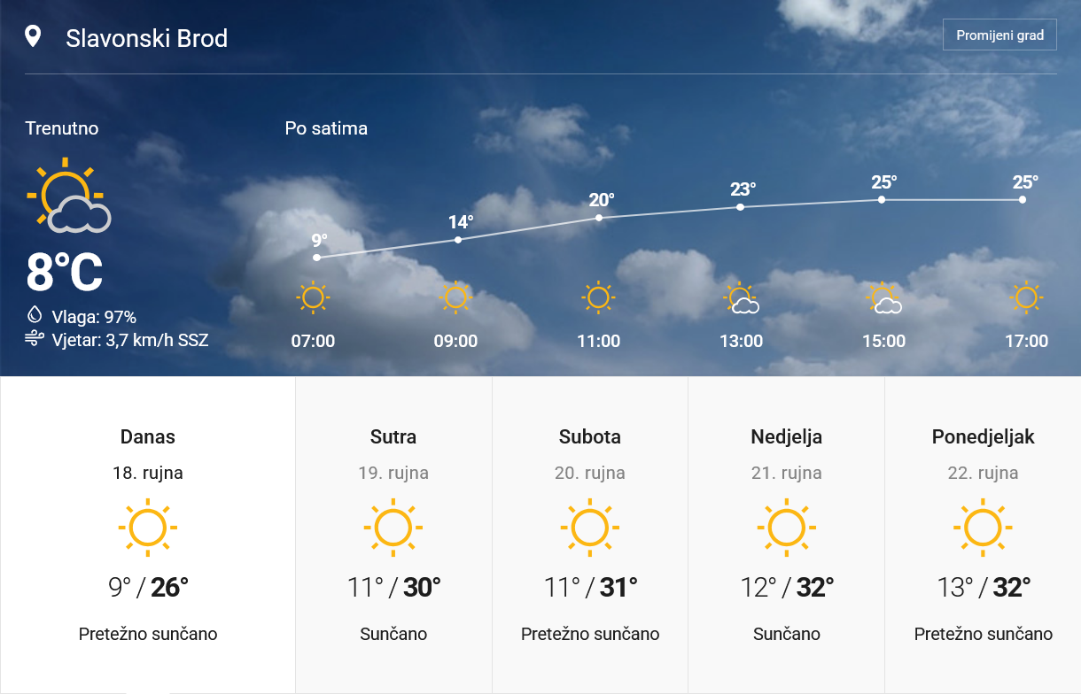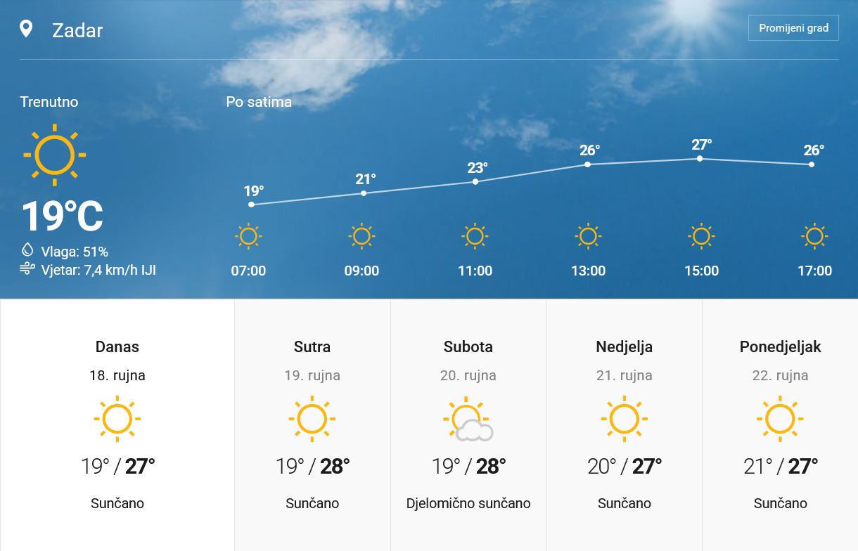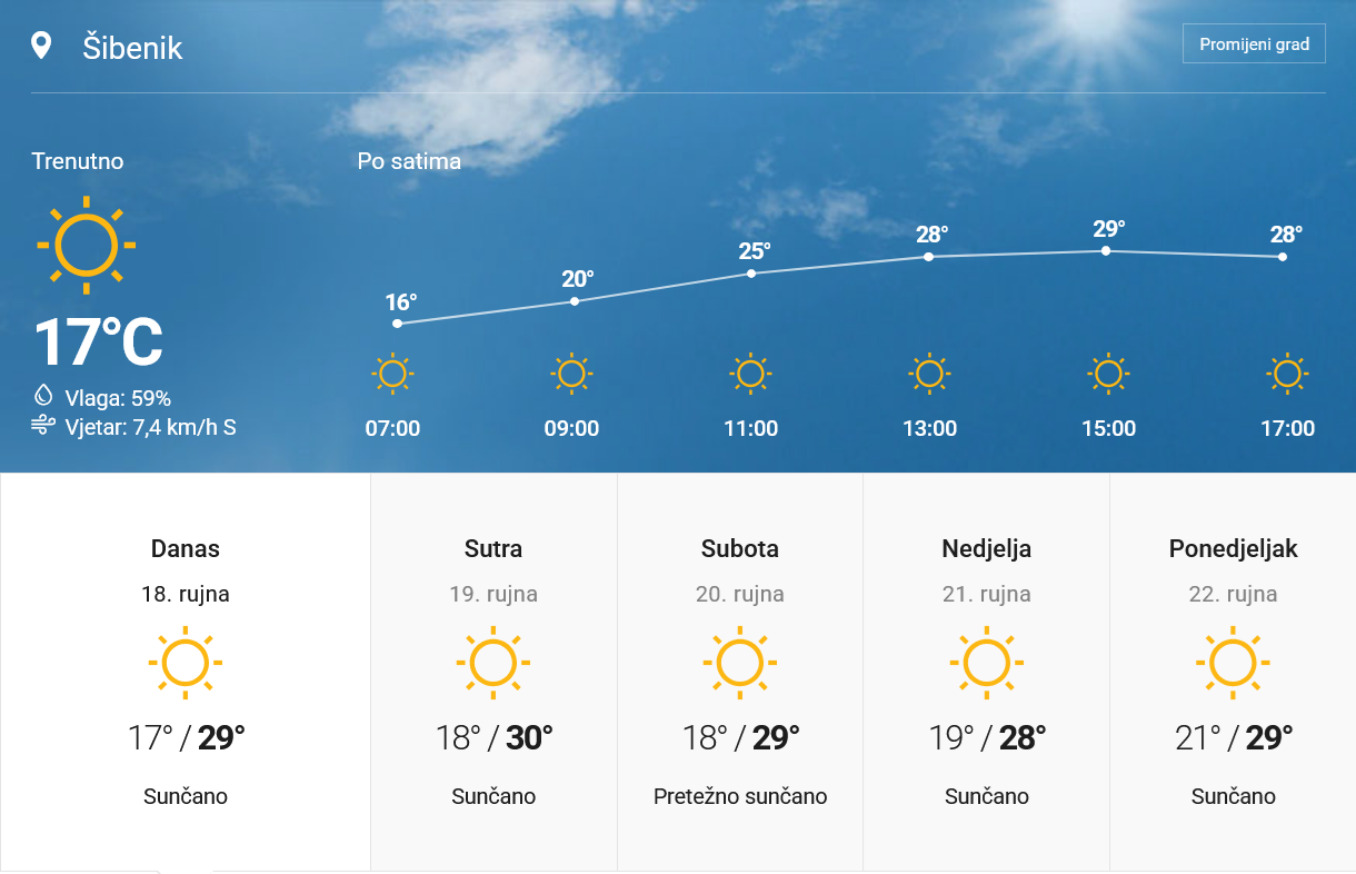 DANAS nas očekuje pretežno sunčano vrijeme, a na Jadranu i potpuno vedro. Na kopnu će ujutro mjestimice biti magle, osobito u nizinama i uz rijeke. Vjetar će biti uglavnom slab, dok će na Jadranu puhati umjerena bura, na jugu u prijepodnevnim satima i jaka. Tijekom dana bura će slabjeti i okrenuti na slab do umjeren sjeverozapadnjak. Najviše dnevne temperature kretat će se između 24 i 29 °C, što znači da će posvuda biti ugodno toplo, a na obali i vrlo toplo.