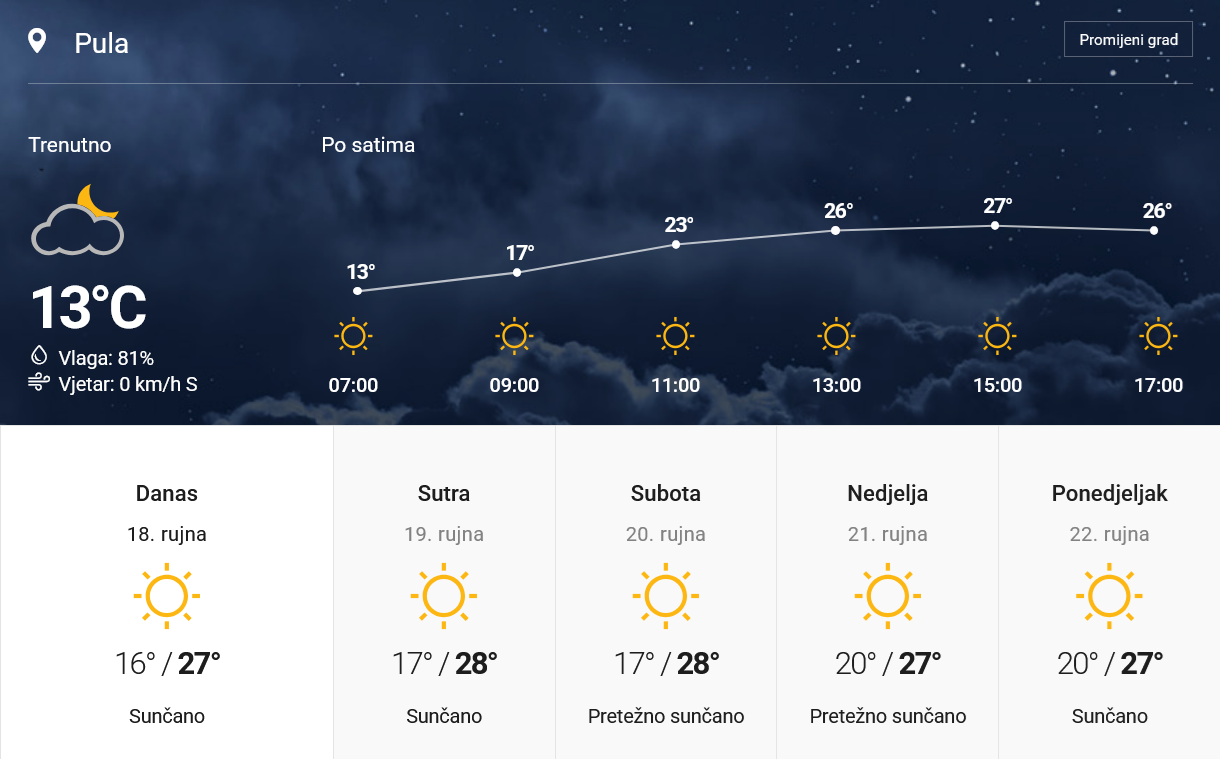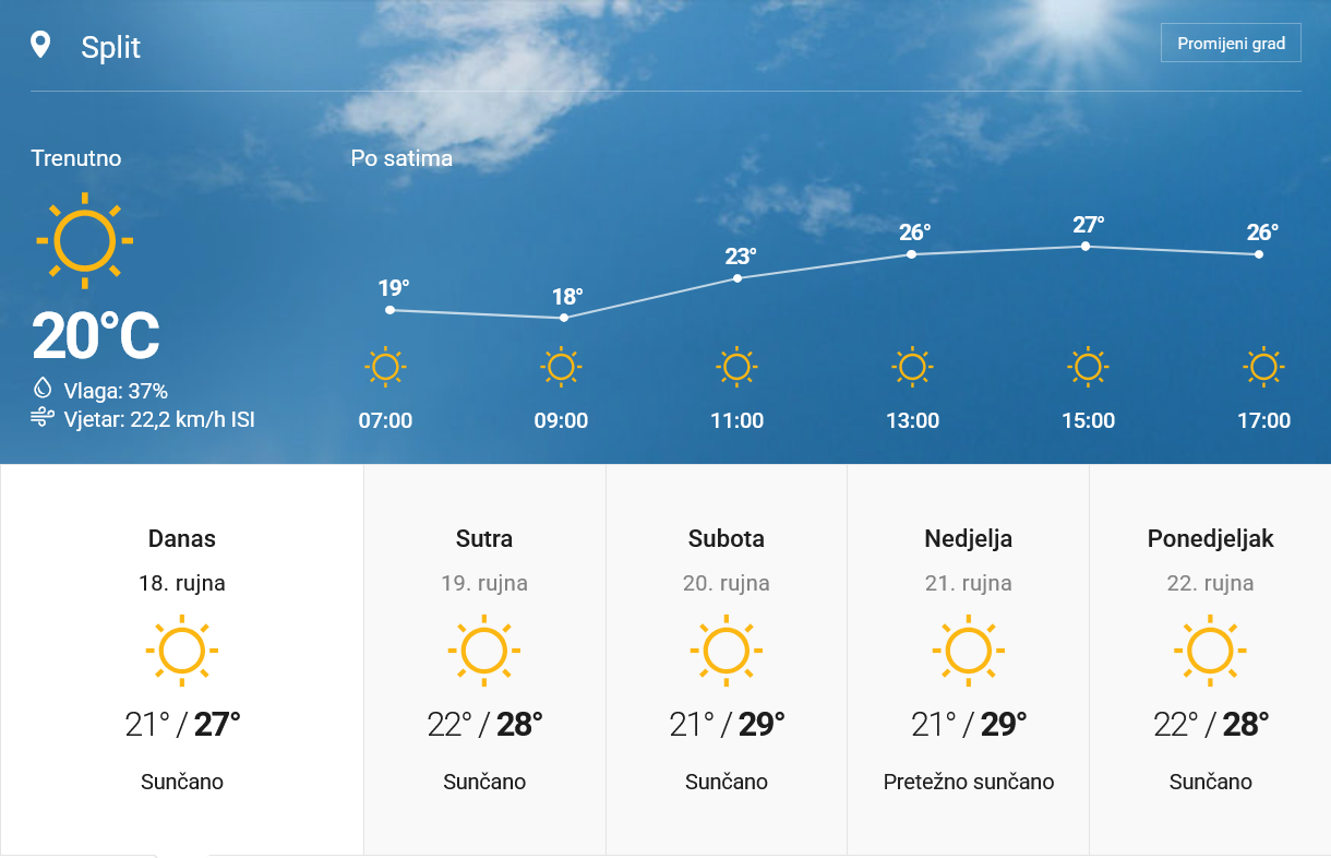 U idućim danima očekuje se nastavak pretežno sunčanog i vrlo toplog vremena. U unutrašnjosti će ujutro mjestimice biti magle, ali će se ona brzo dizati. Vjetar većinom slab, dok će na Jadranu puhati sjeverozapadnjak, a u nedjelju će okrenuti na južni i jugozapadni vjetar. Temperature će se zadržati na sličnim vrijednostima, što znači da nas očekuje stabilno i ljetno ugodno razdoblje.