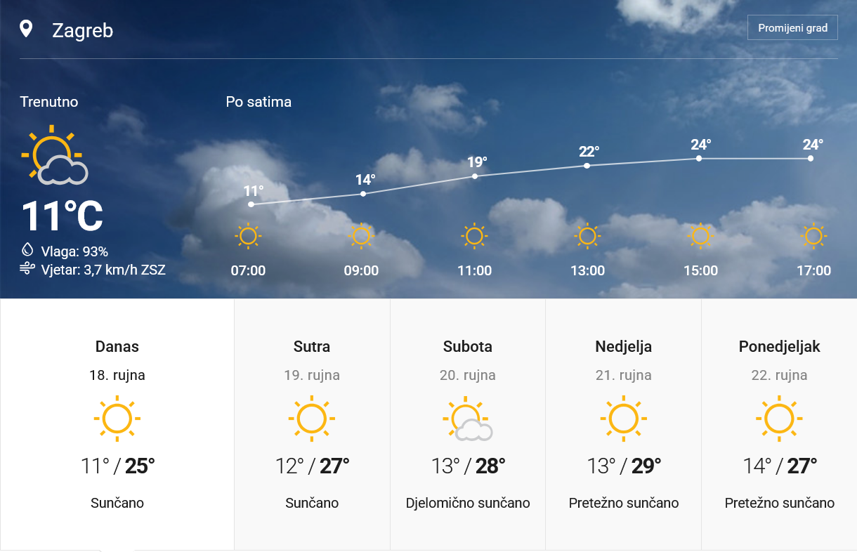 Pretežno sunčano, ujutro mjestimice uz mogućnost magle te prolazno više oblaka u Podravini i Međimurju. Vjetar većinom slab. Najviša dnevna temperatura zraka između 24 i 26 °C.