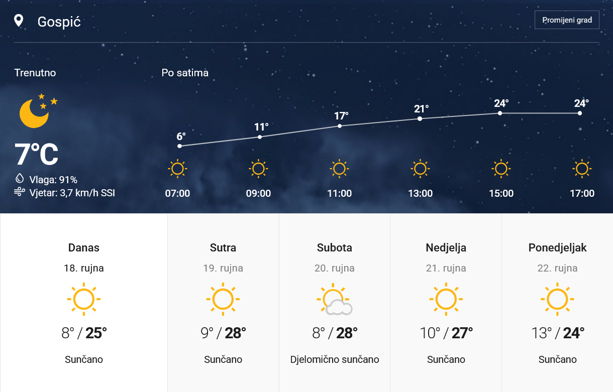 Sutra će prevladavati pretežno sunčano i vrlo toplo vrijeme. U unutrašnjosti će ujutro ponegdje biti kratkotrajne magle, no ona se neće dugo zadržavati. Vjetar na kopnu i dalje slab, a na Jadranu slab do umjeren zapadni i sjeverozapadni. Jutarnje temperature zraka kretat će se između 7 i 12 °C, dok će na moru biti znatno toplije, od 17 do 21 °C. Najviša dnevna temperatura bit će između 25 i 30 °C, što znači da će većini zemlje biti ljetno topli uvjeti.