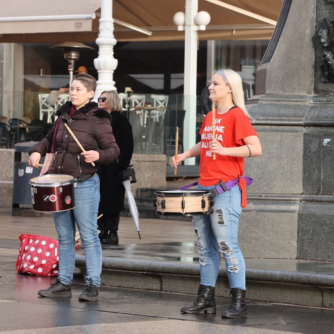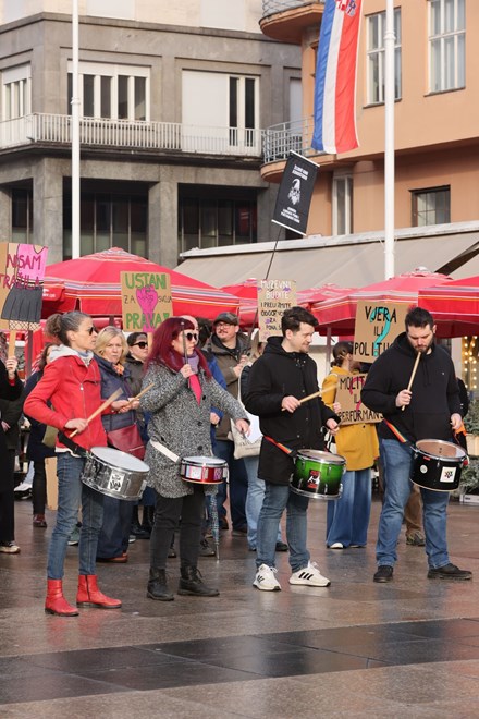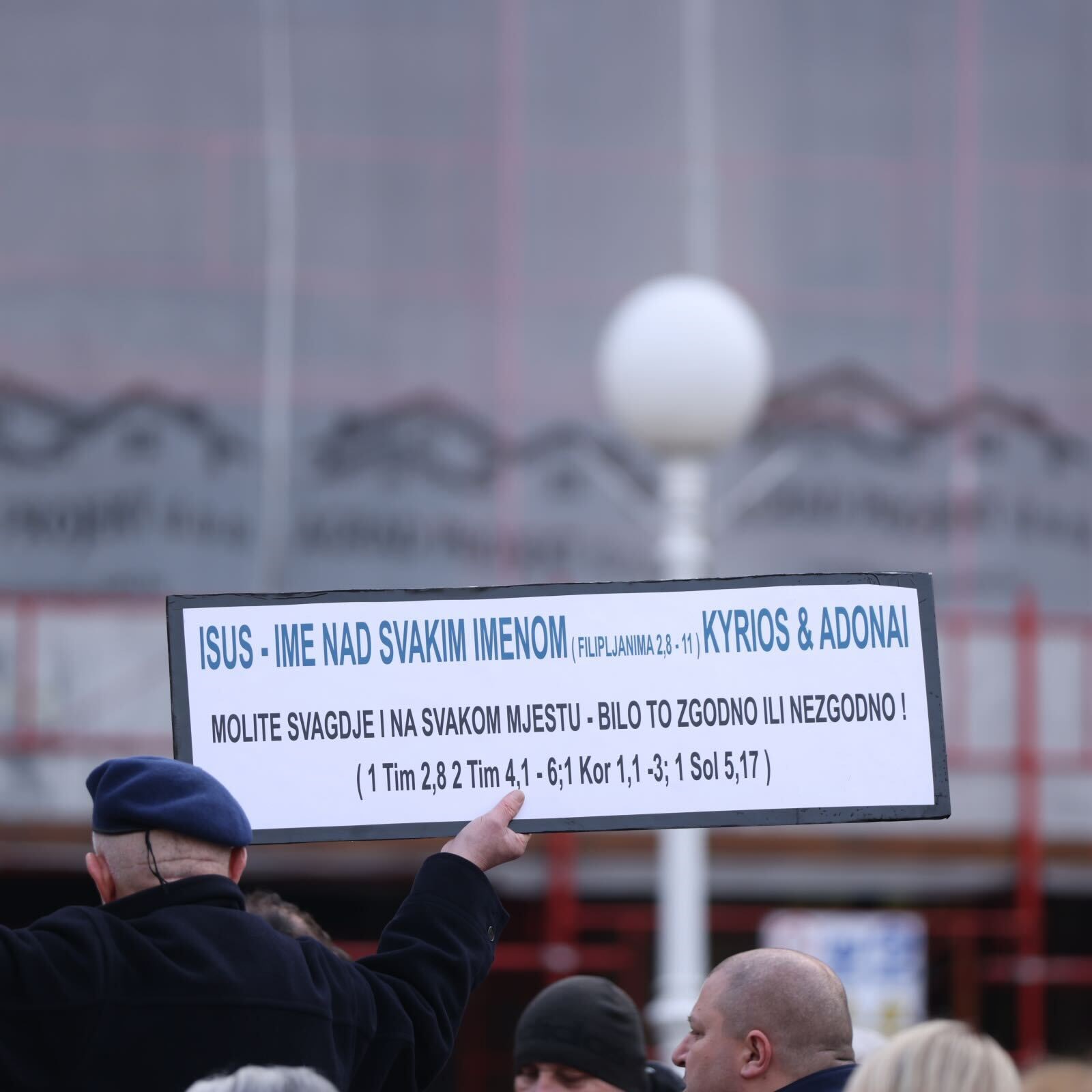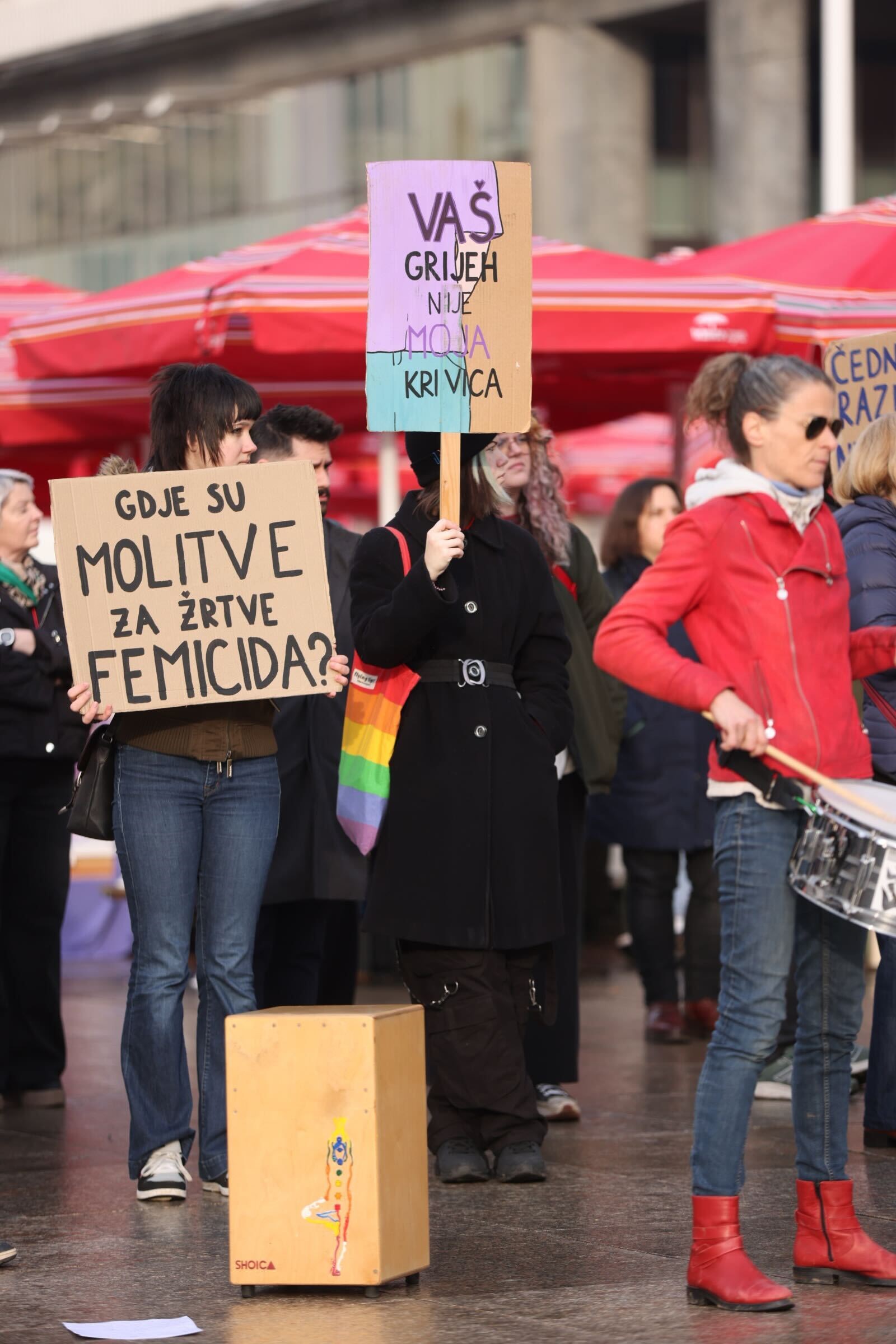 Stigli su i protuprosvjednici. Bubnjali su, svirali, i držali transparente "Gdje su molitve za žrtve femicida" i "Molitva ili performans".