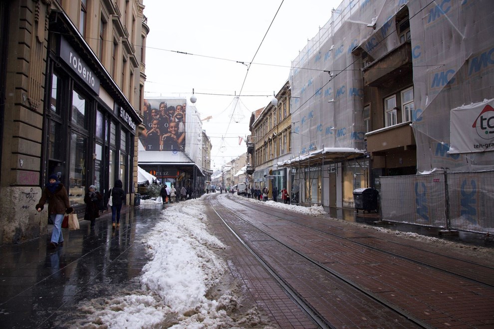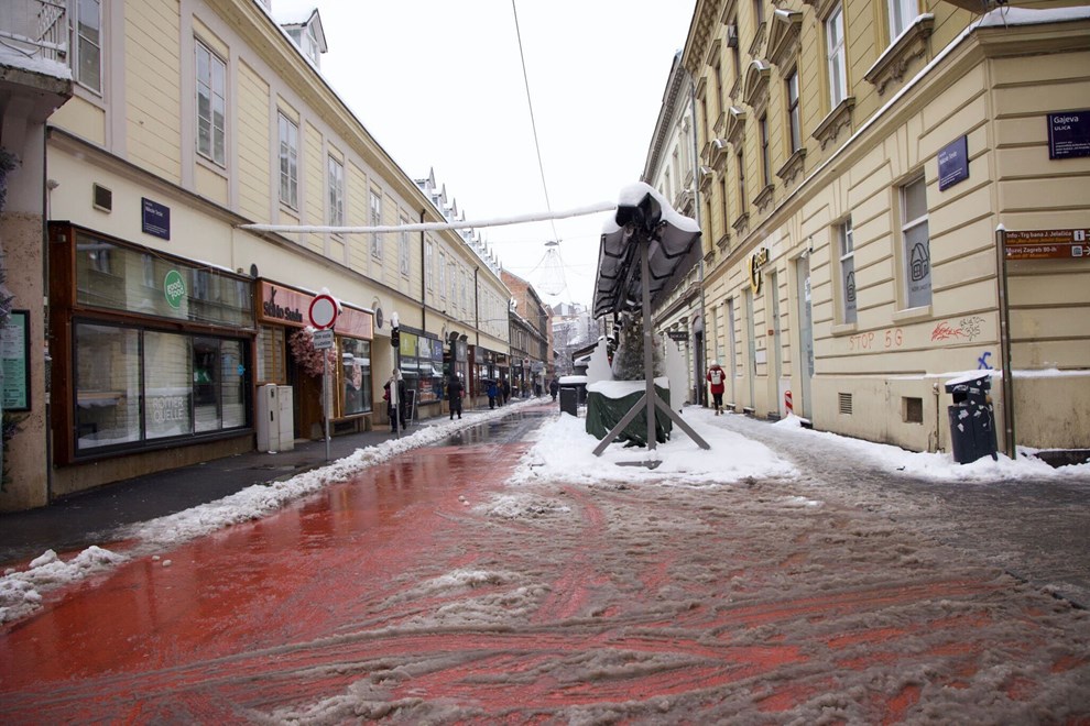 Snijeg se na pješačkim zonama topi i stvara lokve koje otežavaju prolazak pješacima. U galeriji možete vidjeti kako je središte Zagreba izgledalo oko 12 sati.
