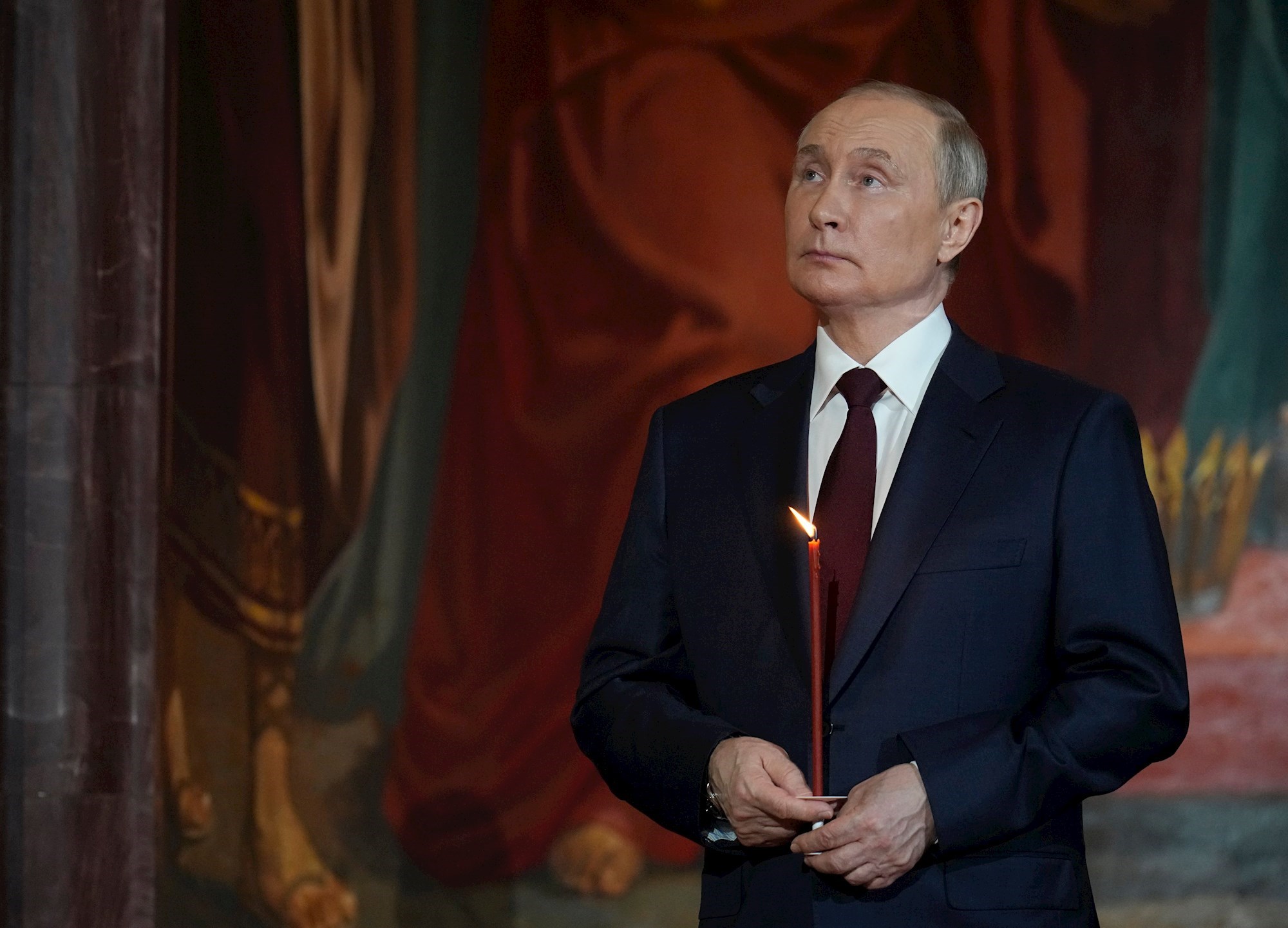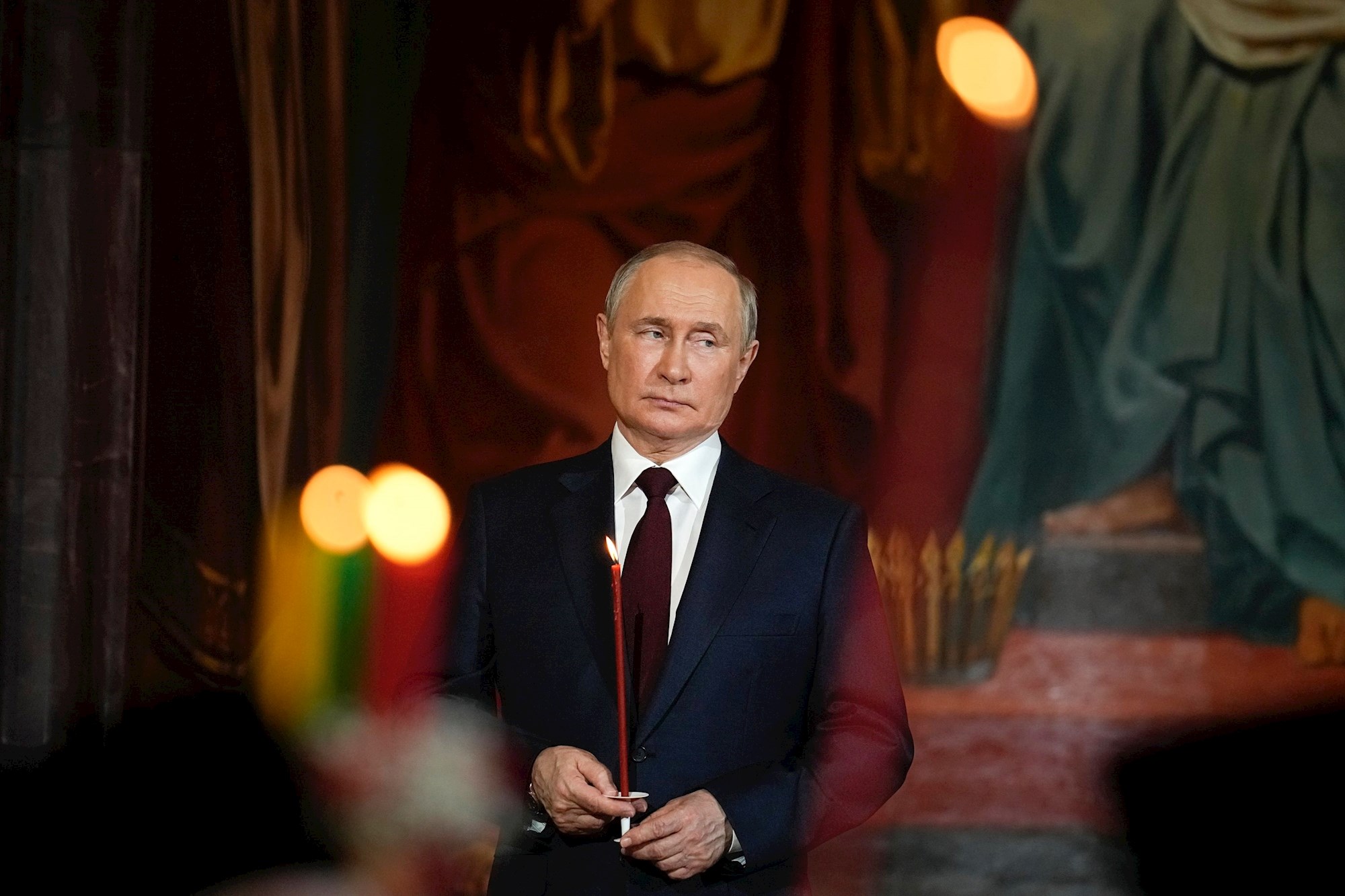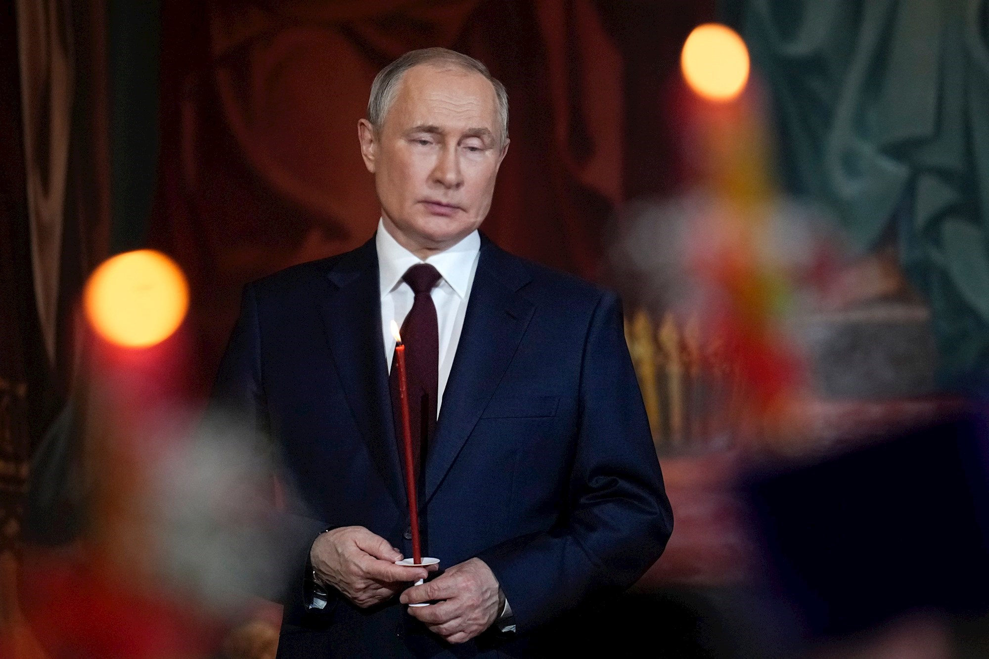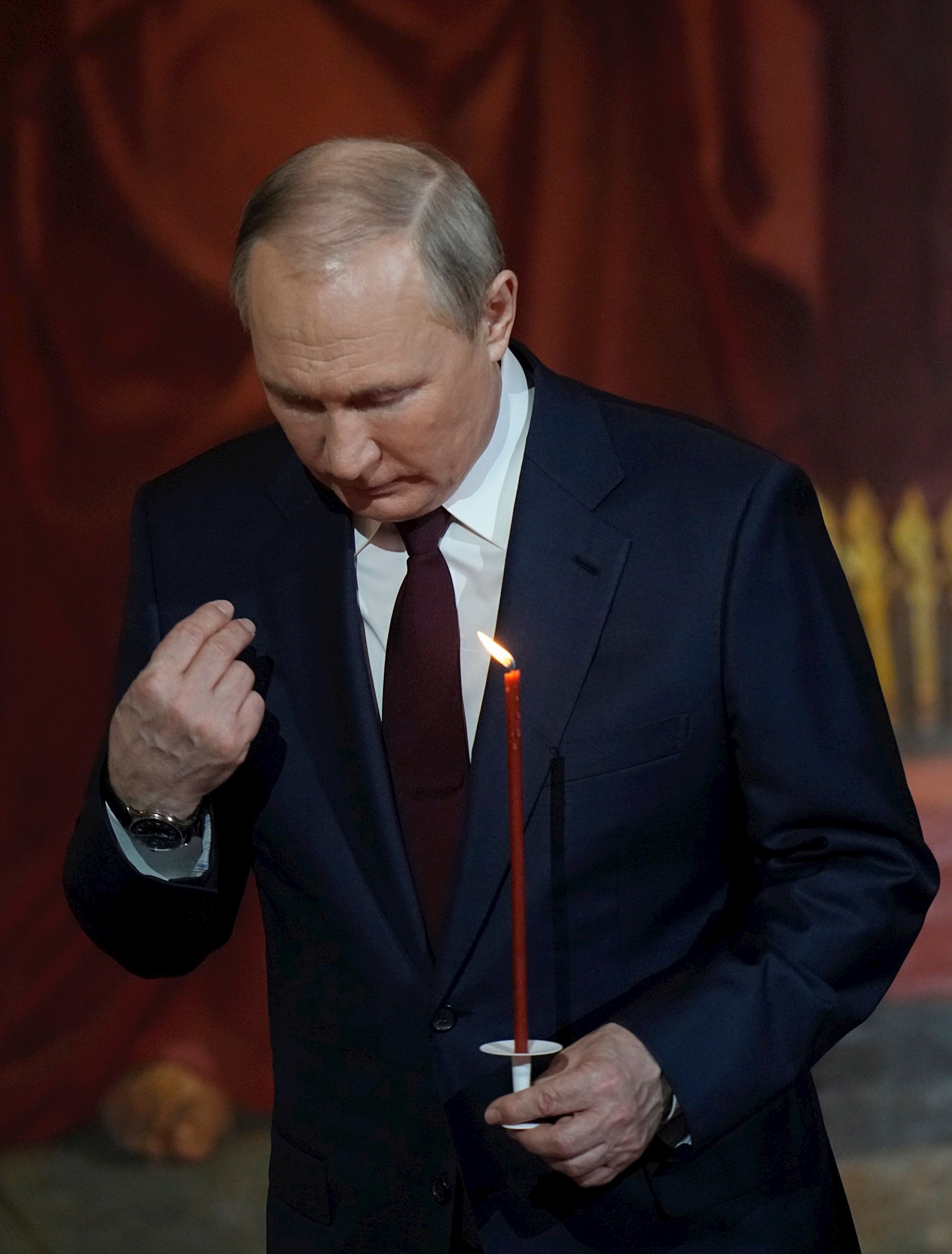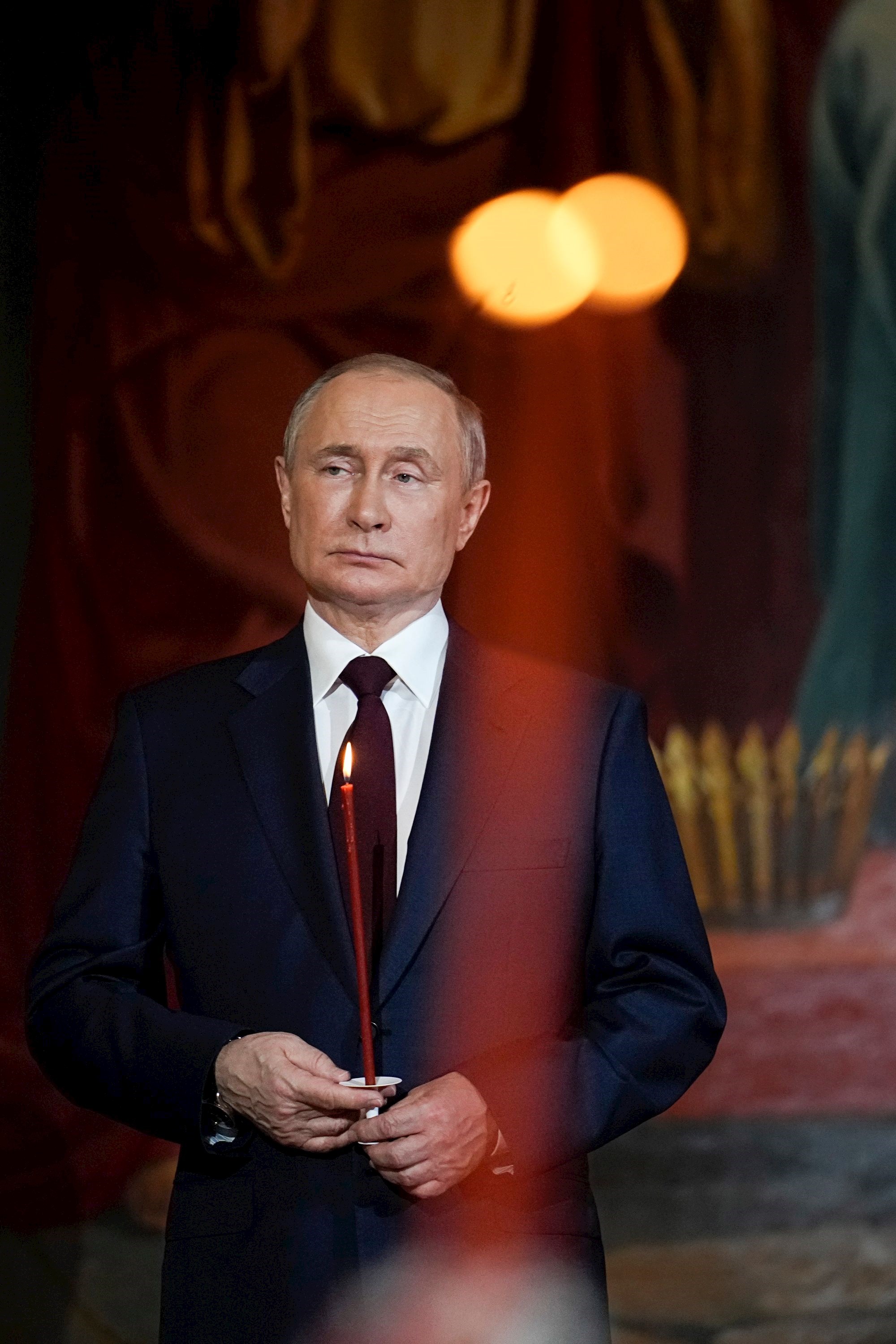 Putin je stajao sa strane u u moskovskoj katedrali Krista Spasitelja, držeći upaljenu crvenu svijeću, tijekom ponoćne mise.