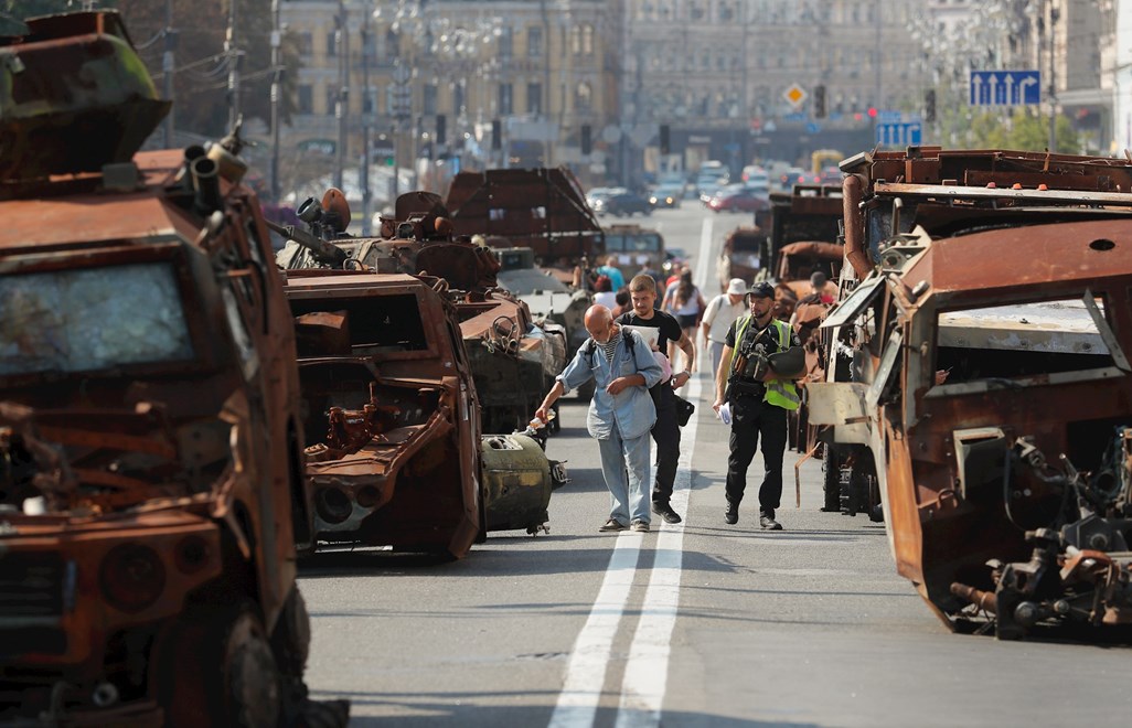 Državni praznik, kojim se u četvrtak obilježava 32 godine neovisnosti od Moskve, pada točno 18 mjeseci nakon što je Rusija pokrenula invaziju na svog južnog susjeda. Ljudi su hodali ulicom Hrešćatik u srcu prijestolnice zureći u pougljenjene armature oklopnih borbenih vozila i druge dijelove opreme, poredane u dugom redu poput vojne parade mrtvih.